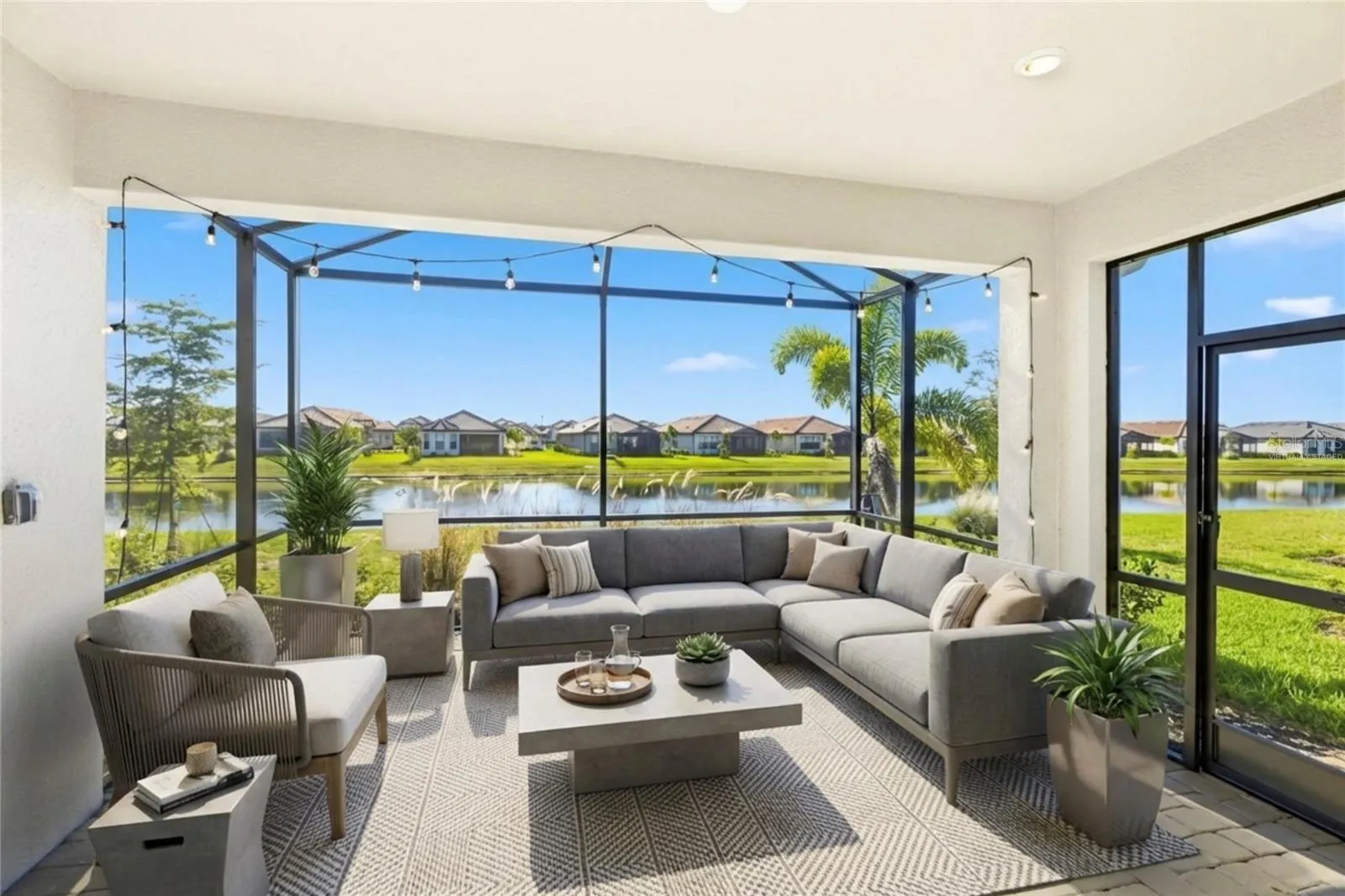 One or more photo(s) has been virtually staged. This is an exceptional opportunity to own a beautiful residence incredibly priced well and desirable due to the privilege of owning a DEEDED GOLF MEMBERSHIP just 1 1/2 blocks from the Clubhouse, Pro Shop and the 1st Tee. This highly sought after feature is available only to a select number of homes for golfing privileges that become fully private in 2027. Located in the exclusive gated community of Azario at Esplanade, this Arrezo Taylor Morrison model delivers with 3 bedrooms, 2 bathrooms and a versatile bonus room all in an open concept layout ideal for everyday comfort and entertaining. Higher volume 10′ ceilings and sliding glass doors allow natural daylight to spill into the living spaces with tranquil water pond views inviting the outdoors in for a nice relaxing ambiance. Tray ceilings can be found in the Primary Suite, Dining and Living Room and Bonus Room. The kitchen includes quartz countertops, a gas cooktop, stainless steel appliances, tile backsplash, taller cabinetry, a closet pantry, barstool counter with seating and overlooks the dining and living areas. Ceramic plank tile flooring in the main living areas and carpeting in the bedrooms are featured in this immaculately maintained newer 2024 home. Exterior quality finishes are evident in the details starting with the paver driveway and entrance, landscaping, tile roof and screened paver lanai viewing the water. The owners have invested on extra storage options including garage ceiling mounted storage racks, additional bathroom and closet cabinetry, 8′ interior doors and an extended patio that has natural gas in place for your grilling adventures. This world class amenity rich community offers resort style living on Florida’s Gulf Coast. Residents enjoy an 18 hole championship golf course, absolutely stunning pools, a full service Spa, dog grooming services, dog park and a State of the Art Fitness Center. Multiple dining and social venues include the Bahama Bar, Barrel House Bistro and Tap Room, excellent Clubhouse dining, the Toasted Cafe along with wine tastings and a culinary center with wood fired pizza options and cooking classes. Active lifestyles are supported with tennis, pickle ball, bocce ball, scenic walking and biking trails, Vitality Park and a dedicated Lifestyle Director orchestrating year round events, wellness programs and 0ocial activities. This home is in a non-flood zone and experienced no hurricane issues.This Mediterranean inspired master planned community blends impeccably maintained homes into a setting that has you feeling like you’re living in a luxury vacation resort every day! Only one owner will have the advantage of claiming this competitively priced home that truly stands apart with its golf deeded membership.