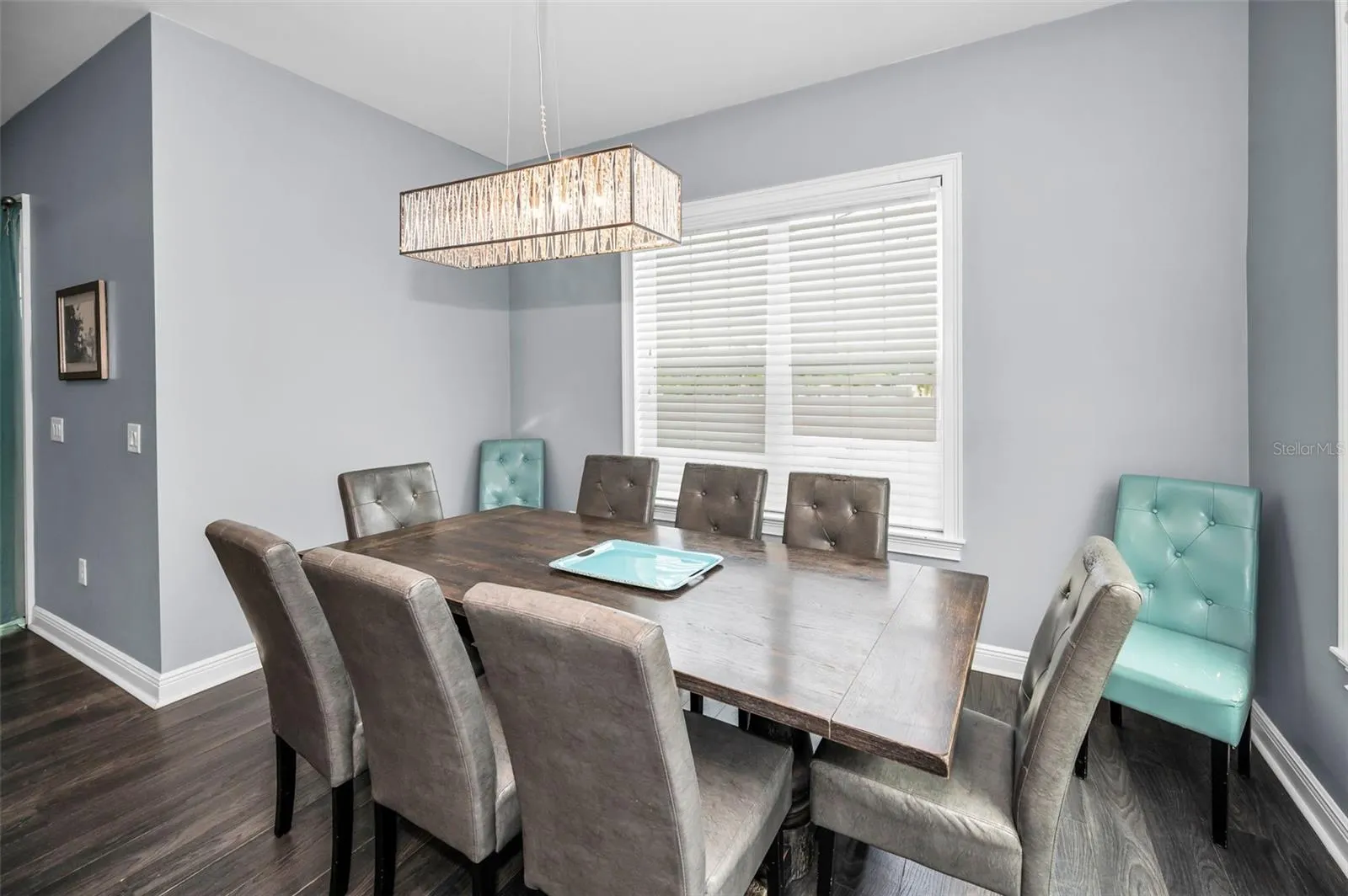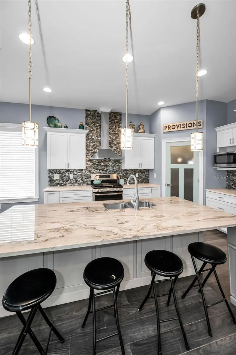 The open-concept main living area is perfect for entertaining and features LVP flooring throughout, contemporary lighting, and abundant natural light. The chef’s kitchen is appointed with quartz countertops, stainless steel appliances, a center island with breakfast bar, shaker-style cabinetry with crown molding, tile backsplash, stainless range hood, and a walk-in pantry with a custom door. A dedicated dining area offers ample space for gatherings and everyday living.