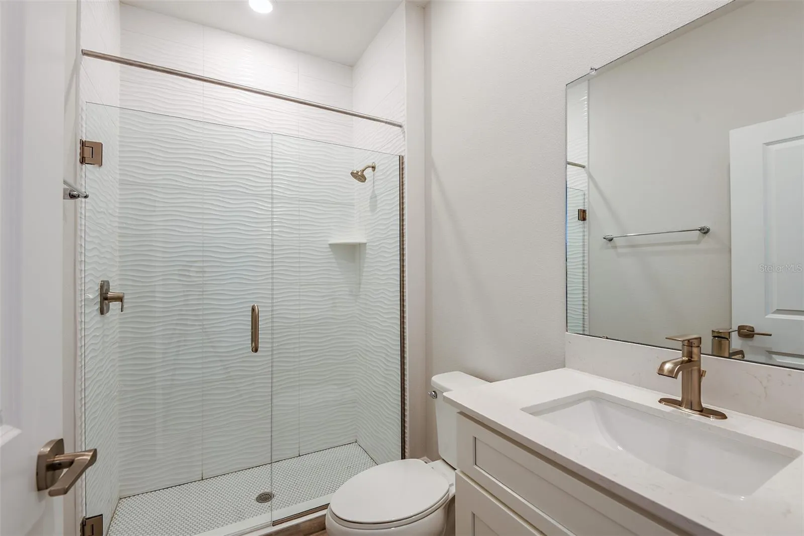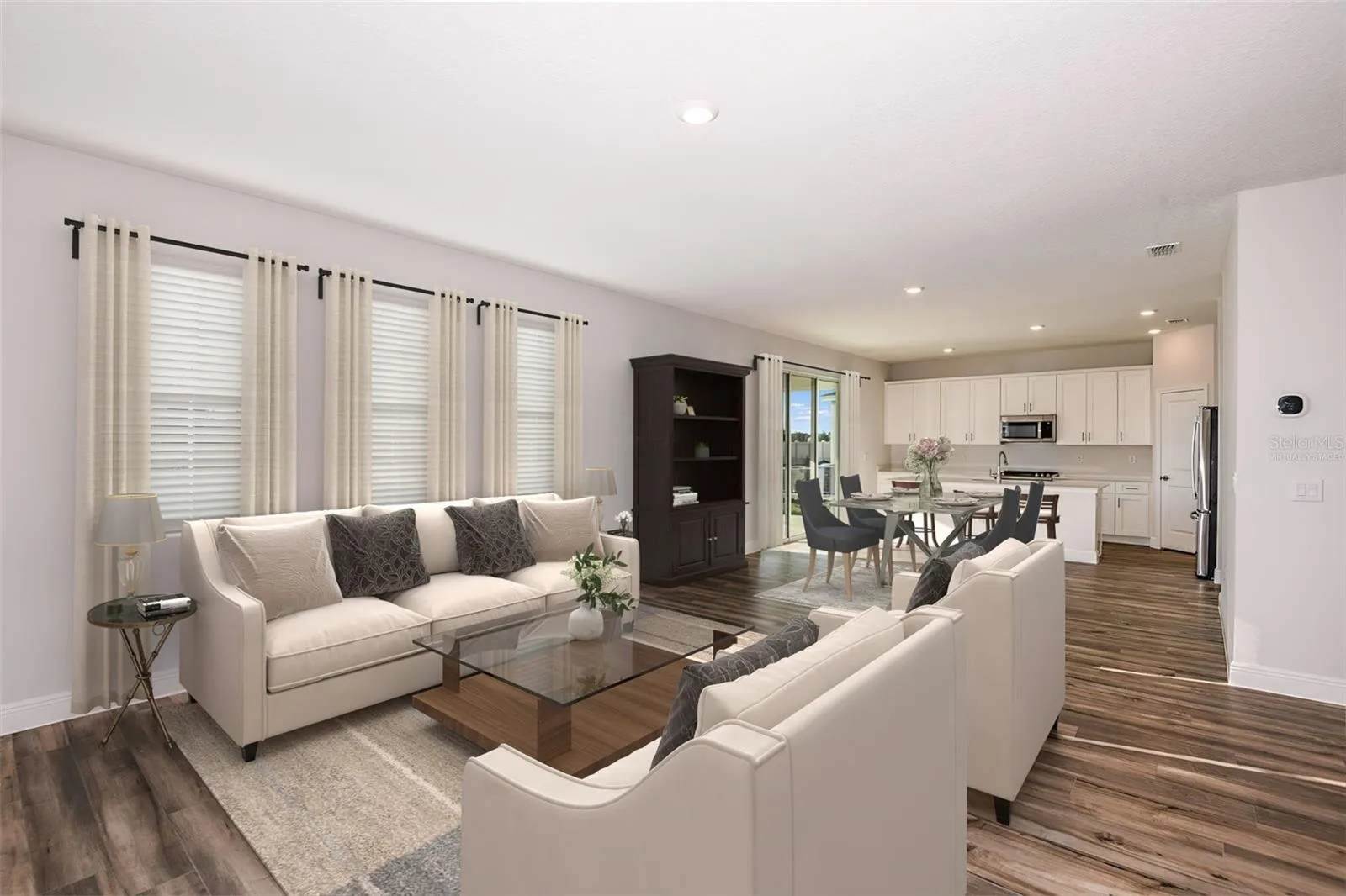 One or more photo(s) has been virtually staged. Under Construction. Welcome to The Amelia, a spacious two-story home designed for comfort, style, and flexible living spaces. With 5 bedrooms, 3 full bathrooms, and a 2-car garage, this thoughtfully designed home has everything you need. Step into the inviting foyer, which leads you to an open and functional main living area. The gourmet kitchen, featuring sleek quartz countertops, stainless-steel appliances, 42” upper cabinets and luxury vinyl plank flooring opens to the lanai through sliding glass doors—perfect for indoor-outdoor entertaining. This home features a smart thermostat with voice control, allowing you to easily adjust the temperature for personalized comfort and energy efficiency, all with a simple command. The first floor also offers a convenient bedroom and full bathroom, ideal for a guest suite or home office. Upstairs, the expansive owner’s suite provides a private retreat with a walk-in shower featuring floor to ceiling tile, a freestanding tub, and a double vanity. Three additional bedrooms, a well-appointed laundry room and a large recreation space complete the second floor, making this home as versatile as it is beautiful. It doesn’t stop there though; this stunning home showcases a stylish elevation enhanced by professionally designed landscaping that adds natural beauty to the home’s inviting appearance.