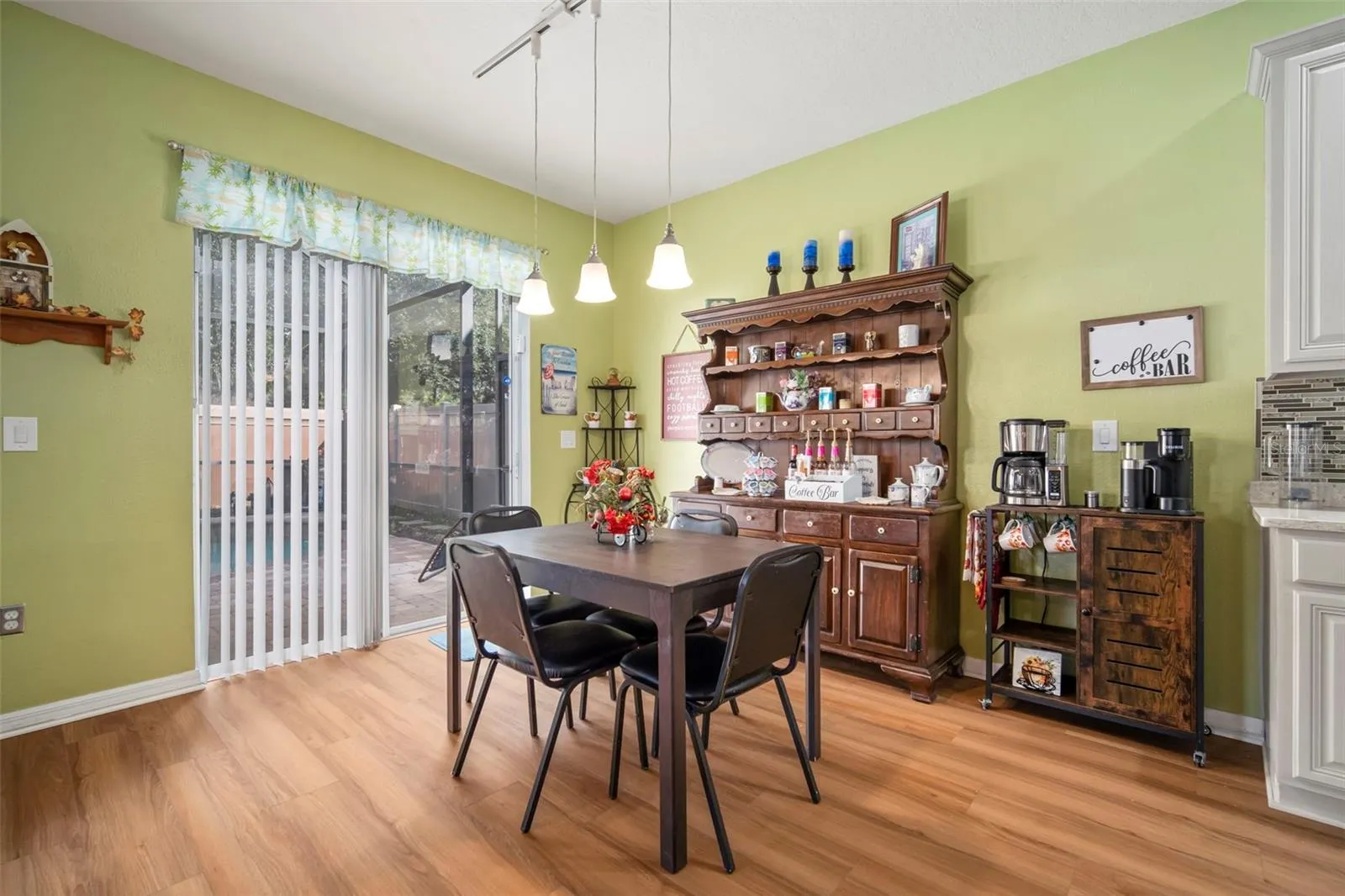 The first floor opens with wide-plank luxury vinyl flooring and a layout that feels open without feeling exposed. The formal dining room is more than a place for meals it’s where long conversations happen, glasses are poured from the built-in wine center, and moments stretch past the clock. Nearby, an updated half bath adds convenience while keeping the flow uninterrupted. At the center of the home, the great room and kitchen come together in a way that invites connection. Quartz countertops, updated cabinetry, dual ovens, and generous workspace make the kitchen as functional as it is welcoming whether you’re easing into a quiet morning or hosting without ever feeling cut off from the room. This is a space designed to be lived in, not staged.