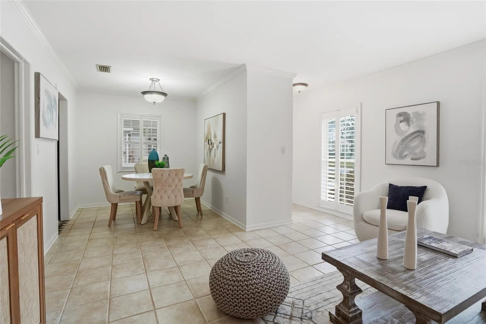 The property includes a single-car carport with an attached storage area, both positioned within the original roofline—creating a rare opportunity to easily enclose and convert to a one-car garage if desired. Upon entry, you’re welcomed by a functional foyer with a coat closet featuring a built-in combination safe. The family room and open-concept dining areas are anchored by large six-foot, front-facing windows, flooding the space with natural light. The kitchen is well-appointed with granite countertops, stainless steel appliances, white shaker cabinetry extending to the ceiling with crown caps, soft-close doors and drawers, tile backsplash, and under-cabinet lighting—a timeless and practical design.