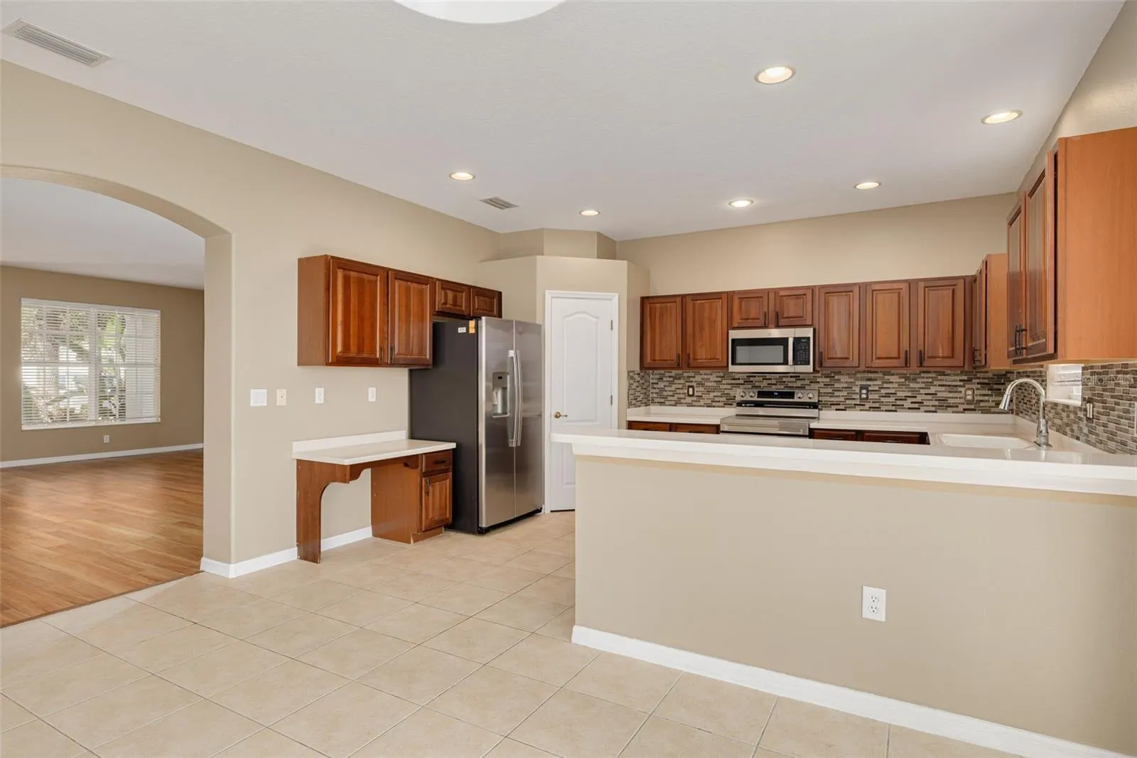 Located in the established resort-style community of Heritage Harbour, this home offers a quiet retreat with a functional, open layout. The large backyard and screened porch provide a private outdoor space overlooking a serene lake and protected conservation area. The heart of the home is a wide-open living space that connects the kitchen to a combined dining and family room. The kitchen is designed with both storage and utility in mind, featuring, rich Cherry Spice cabinetry and a custom backsplash, an integrated desk area for a convenient home workstation, a layout optimized for hosting and daily meals. NEW roof installed in 2025