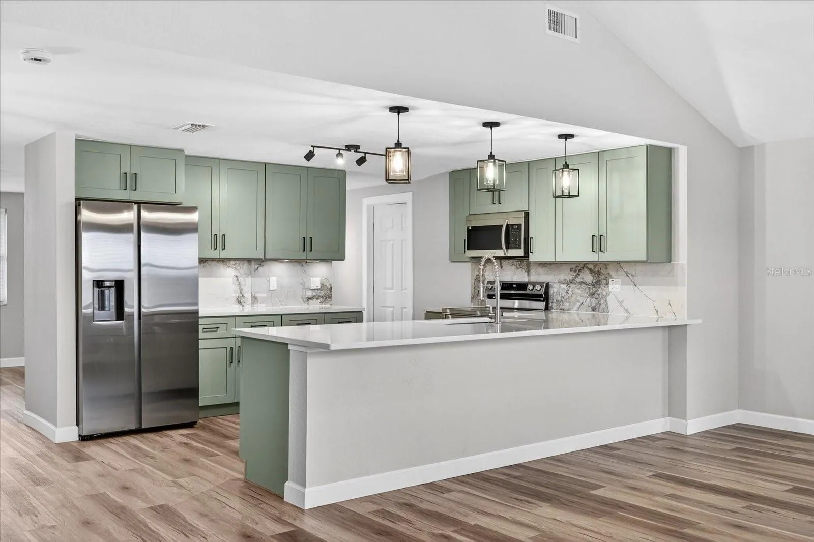 The stunning kitchen is the heart of the home, showcasing stainless steel appliances, quartz countertops, and elegant sage shaker cabinetry, creating a timeless yet modern coastal feel. A split bedroom floor plan offers privacy and functionality, while the primary suite boasts an oversized walk-in closet for added comfort and convenience. Major upgrades include a new HVAC system and secondary/flat roof, ensuring peace of mind for years to come.