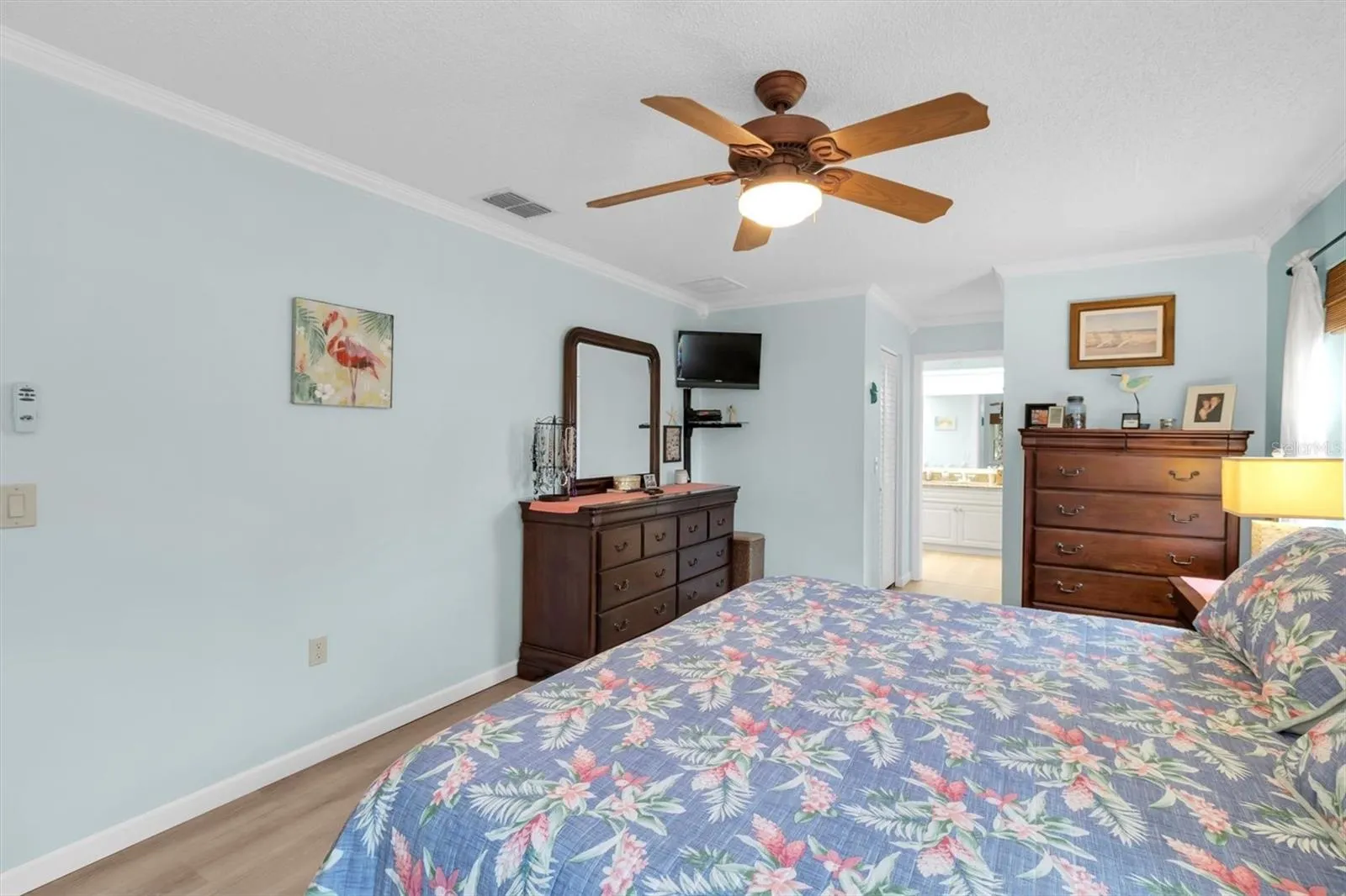 - Ceiling Fans(s), Crown Molding, Open Floorplan, Walk-In Closet(s), Living Room/Dining Room Combo, Eat-in Kitchen, Kitchen/Family Room Combo, Primary Bedroom Main Floor, Split Bedroom, Window Treatments, Stone Counters, Solid Wood Cabinets, Solid Surface Counters