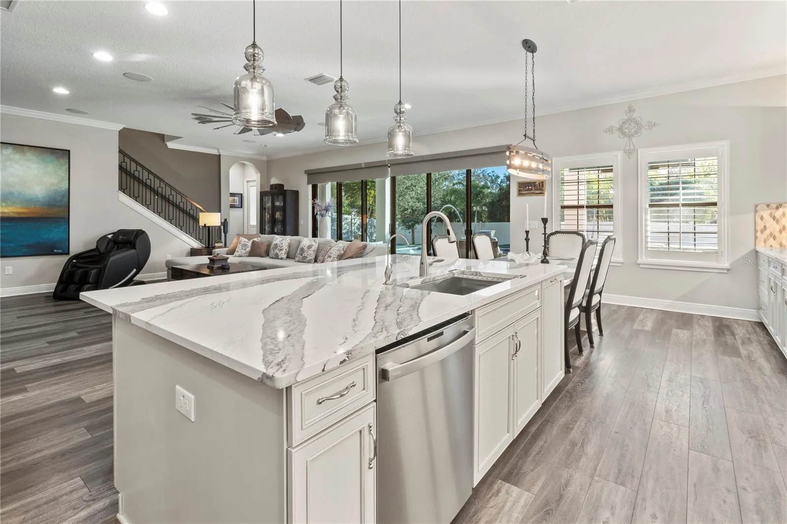 The layout features spacious open areas, perfect for both relaxation and entertaining. Large windows throughout provide an abundance of sunlight, enriching the interior’s atmosphere. The open concept design seamlessly connects the living room to the dining area, creating an inviting space for gatherings.