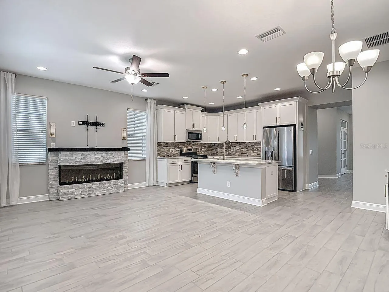 - Ceiling Fans(s), Open Floorplan, Thermostat, Walk-In Closet(s), Kitchen/Family Room Combo, Window Treatments, Stone Counters, Smart Home, Solid Surface Counters, In Wall Pest System, PrimaryBedroom Upstairs