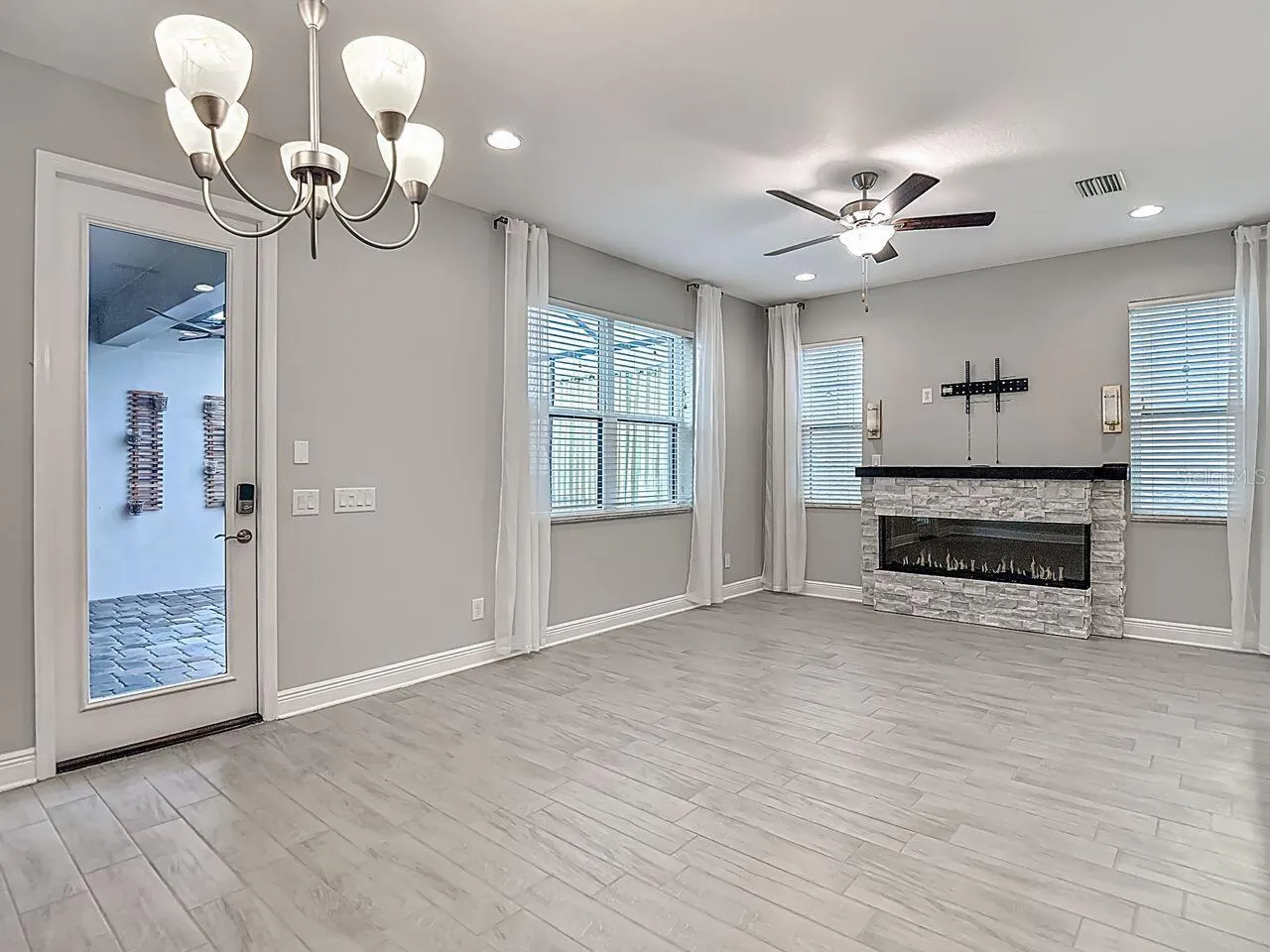 Welcome home to maintenance free living in Tampa Bay’s #1 community. With beautiful views of year round ponds and conservation. Freshly painted inside and out, 12538 Rangeland Blvd. is for you! The beautiful Townhomes of Whitfield Park, in the much sought after Starkey Ranch have so much to enjoy. This MI Homes Chatham model has a pavered front porch to rock your evenings away, three bedrooms, 2.5 baths, flex room, and its an END unit, bringing in natural light. The upgraded bright kitchen has stainless steel appliances, gas stove, microwave, refrigerator, 42in light shaker cabinetry, quartz countertops, stone backsplash, and a coffee bar to boot. There’s also a pantry and under stair storage. Cuddle up in front of the 60in light stone REALISTIC multi sided electric with heat fireplace. Newly cleaned and sealed neutral wood look tile covers the first floor. Additionally, the downstairs half bath has a large closet for storage. The first floor flex room/office boasts glass french doors for privacy. The wood staircase takes you to the owners space with en suite bath, additional bedrooms, guest bath, and upstairs laundry with included washer/dryer, laundry sink, and cabinetry for convenience. For outdoor living, the hugh brick pavered and screened lanai is just the place, including a covered pass through from the two car garage to the home. The walkway, front porch, lanai, and garage driveway are all pavered. The home includes a tankless water heater, whole home water softner, newer 2023 complete A/C system, and all windows have 3M safety/UVA/UVB film installed in 2025 to keep the utility bills low. The home is prewired for a security system and has hurricane shutters. All this in a community with 22 miles of walking and biking trails, lakes, parks, three pools, multiple dog parks, tennis courts, soccer fields, lacrosse, softball, and baseball fields, in the District Park. There’s even an A-rated K-8 Magnet school and Preschool in the community. Publix, lots of shopping, the Suncoast Pkwy/Veterans Expressway, and lots of eatery’s are minutes away. Low HOA dues cover exterior maintenance, lawn and landscaping, irrigation, and pest control. The outside entire building was just painted in October of this year. This one is sure to impress. Come see for yourself.