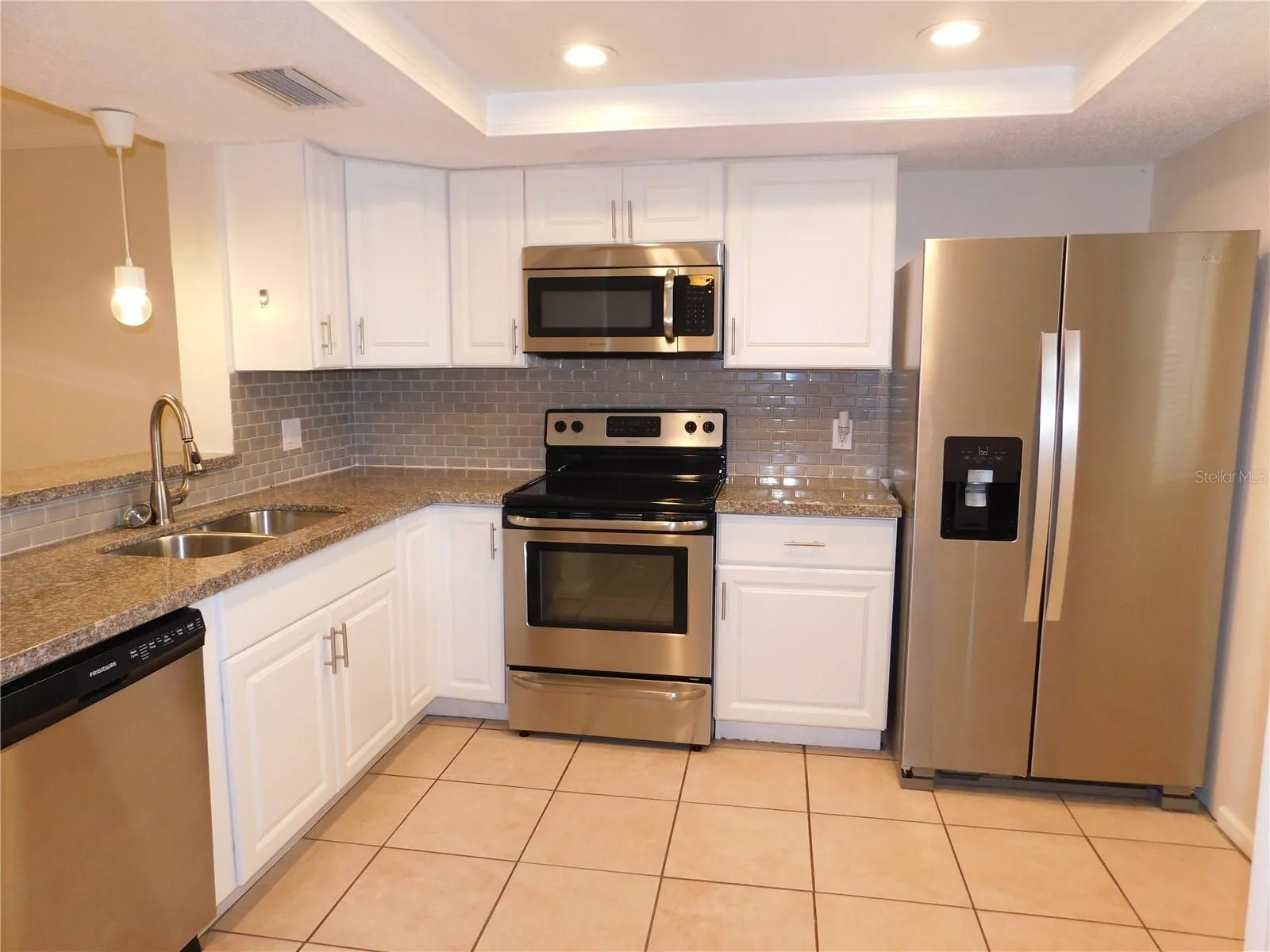 First-floor two-bedroom condo ideally located in the Countryside area, just north of Westfield Mall, tucked away within the quiet and well-maintained Casa del Sol community. A large tiled, screened-enclosed front porch welcomes you to the entrance foyer, which opens into a spacious living and dining area. The bright, open kitchen features granite countertops, tiled backsplash, stainless-steel appliances, a hidden wall-closet pantry, and a convenient pass-through window to the dining area.
