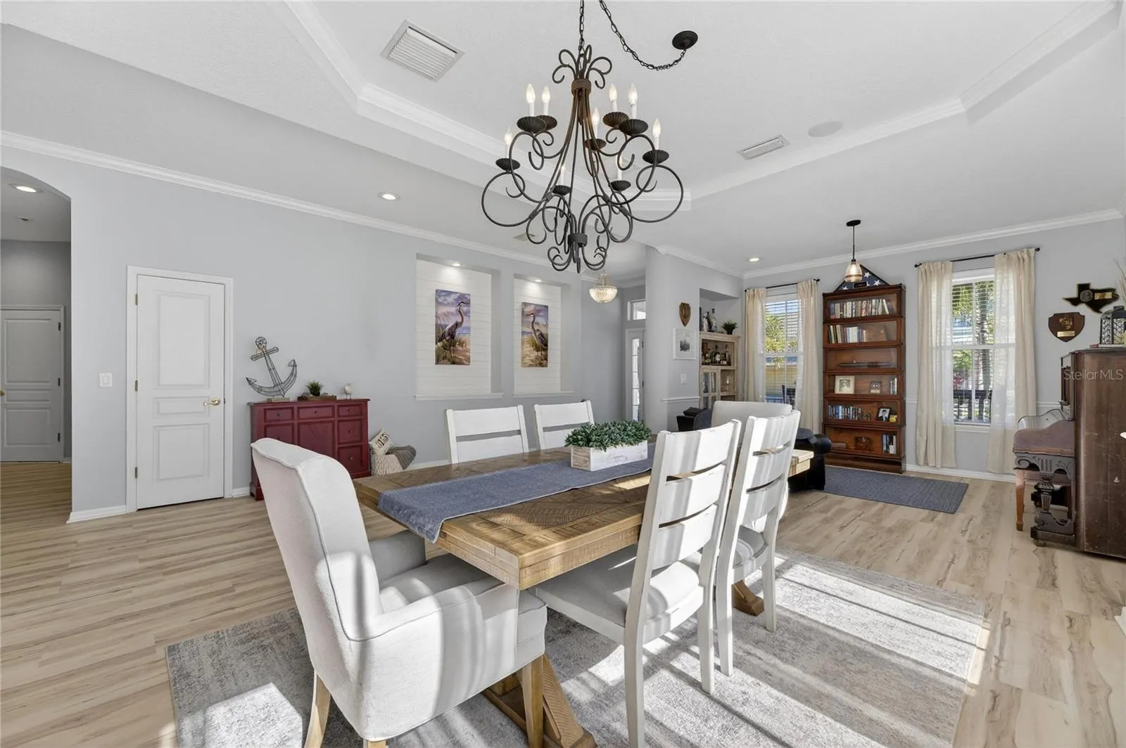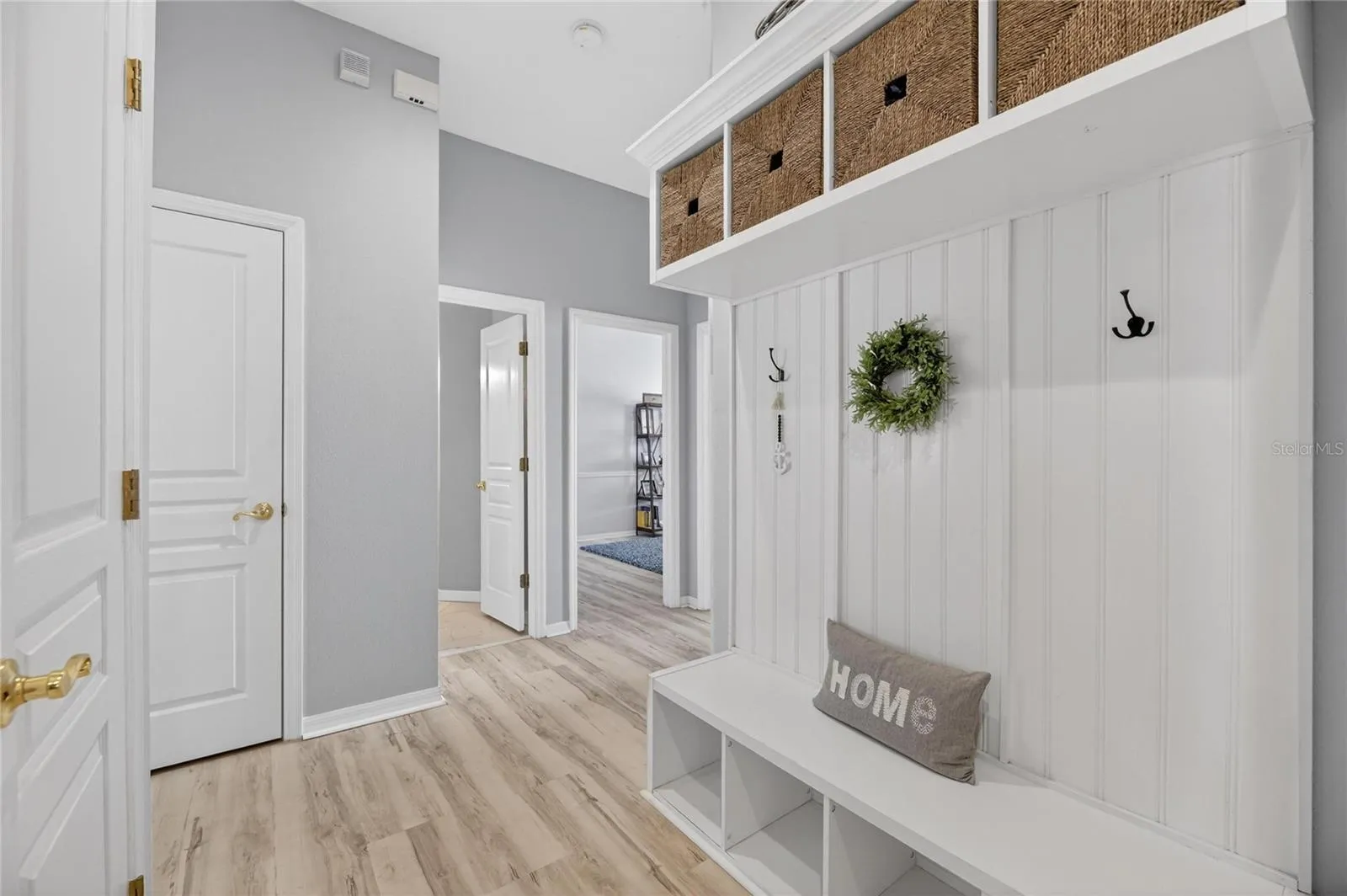 Inside luxury vinyl flooring runs throughout complimented by crown molding, tray ceilings, recessed lighting, arched doorways, and custom art niches. The home features a natural gas fireplace, built-in mudroom, ceiling fans, a neutral finishes, attic flooring for added storage, and a whole home water softener and filtration system.