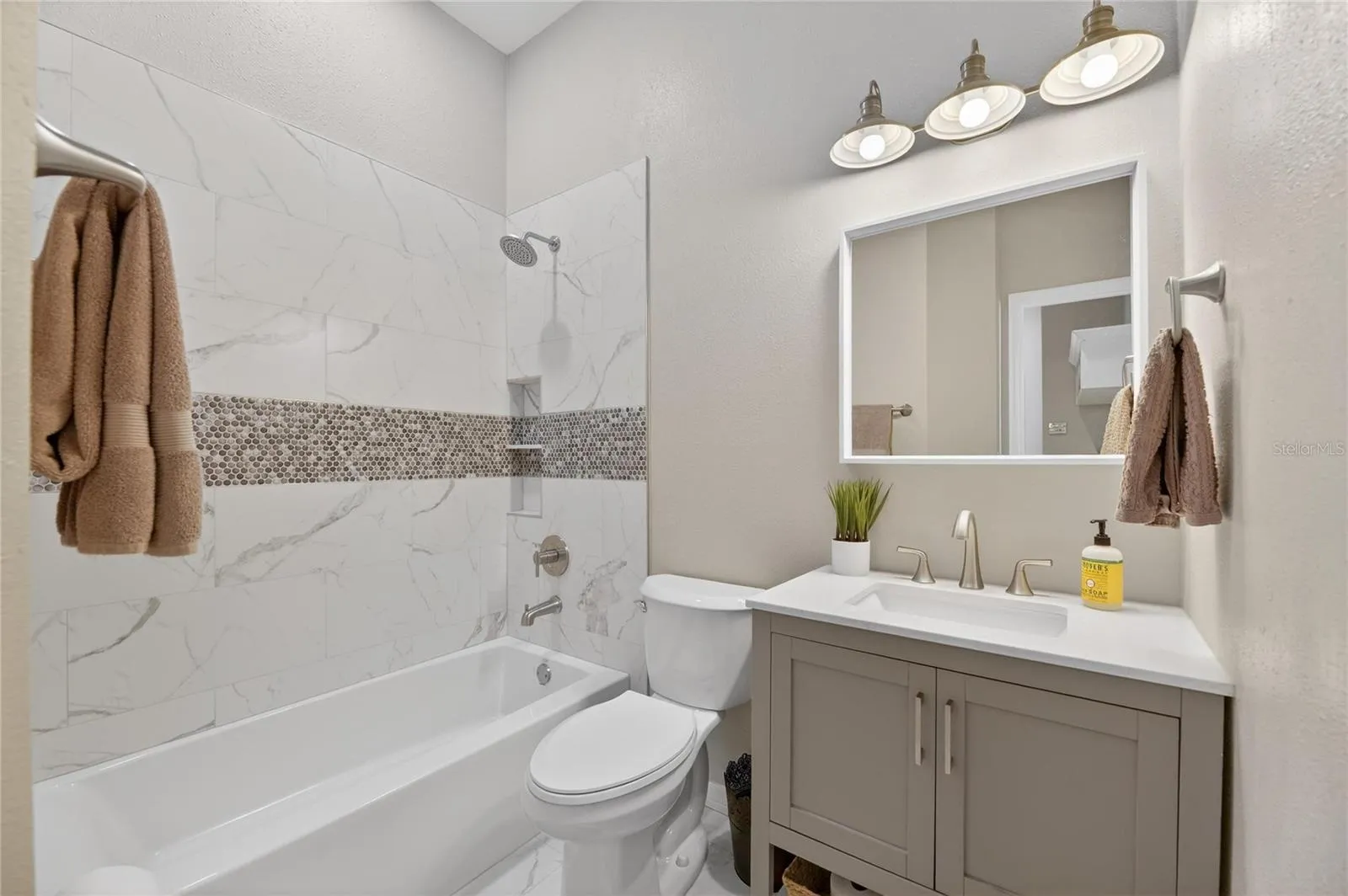The primary suite offers a private retreat with a walk-in closet, dual split-sink vanities, a freestanding soaking tub, and a frameless glass shower with a rain shower head and full tile surround.