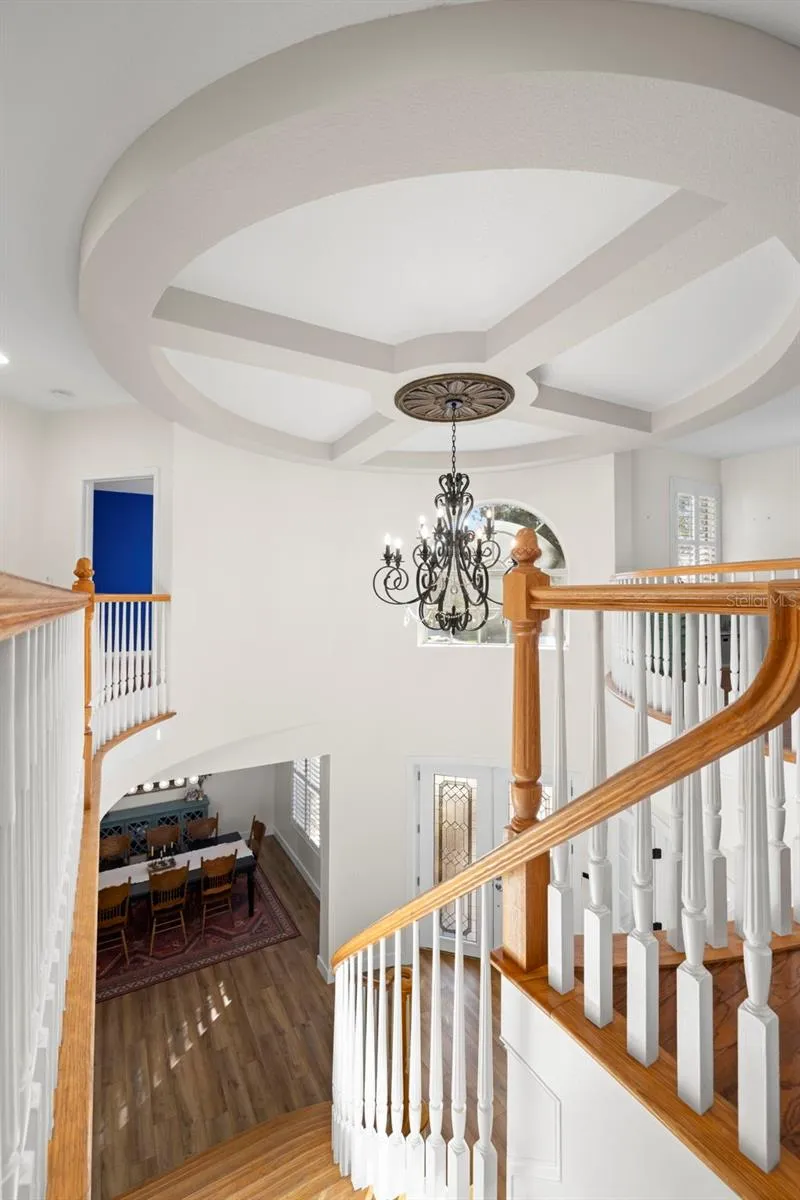 - Ceiling Fans(s), Crown Molding, Thermostat, Walk-In Closet(s), Eat-in Kitchen, Kitchen/Family Room Combo, Split Bedroom, Window Treatments, High Ceilings, Stone Counters, Solid Wood Cabinets, In Wall Pest System, Tray Ceiling(s), Built-in Features, PrimaryBedroom Upstairs, Coffered Ceiling(s)