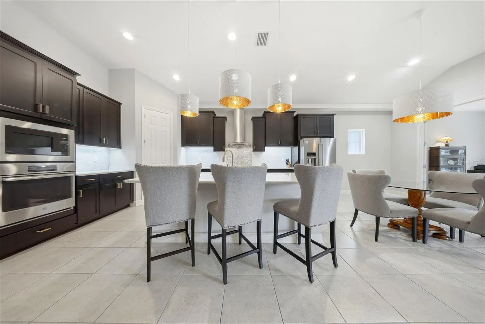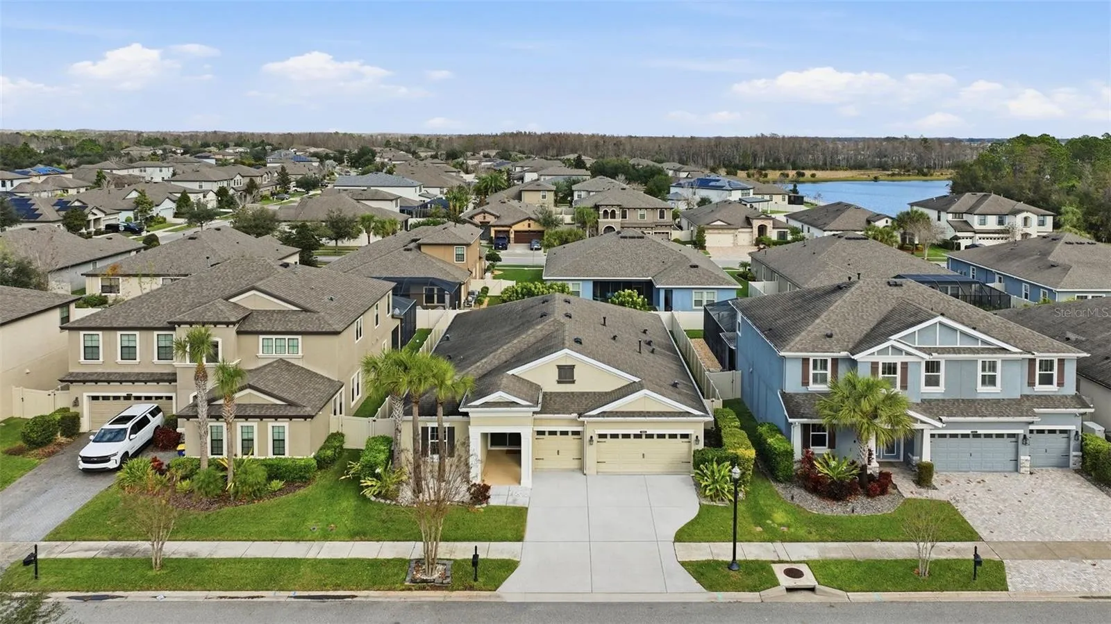 WELCOME to this BEAUTIFUL 4 bedroom, 3 bath home with a 3 car garage offering 2,738 sq ft of thoughtfully designed living space in the sought-after community of Connerton. Enter through ELEGANT double doors to find two front bedrooms that share a full bath with a tub/shower combo, ideal for guests or family. The heart of the home features a spacious open-concept kitchen and living room, perfect for entertaining. The kitchen is equipped with wood cabinetry, under cabinet lighting, tiled backsplash, QUARTZ countertops, built-in oven, cooktop, stainless steel hood, all stainless steel appliances, and a NEW KitchenAid refrigerator and dishwasher, along with a WALK-IN pantry. A large center island provides seating and space for casual everyday dining. Just off the kitchen is a versatile room with glass French doors that can be used as a formal dining area or home office, filled with natural light and views of the backyard. Unwind in the EXPANSIVE living room with STUNNING backyard views through FOUR PANEL glass sliders. The PRIVATE primary suite is tucked away on the opposite side of the home and features walk-in closets and an ENSUITE bathroom with dual sinks and a large fully TILED walk-in shower. An additional bedroom and full bath with single vanity and tub/shower combo offer flexibility for guests or family. The laundry room includes extra cabinetry for added storage, and the entire home is finished with ceramic tile for easy maintenance. Step outside to a beautifully FENCED backyard with a large covered lanai, providing ample space for entertaining while keeping furniture protected from the elements. The extended yard features a wood PERGOLA set on cement tile and stone flooring, creating a cozy RETREAT perfect for relaxing by a fire, surrounded by mature trees for added privacy. This home is loaded with upgrades, including plumbing for a future outdoor kitchen, all new high-efficiency toilets (2025), DESIGNER LIGHT fixtures in the entry hallway and kitchen, pre-wiring for a sound system, new window screens, dual handheld showerheads in all bathrooms, and an EPOXY-COATED garage floor. The property is beautifully LANDSCAPED and truly move-in ready. Connerton offers resort-style amenities including a clubhouse with community events, a resort pool with splash park, lap pool, fitness center, tennis, basketball and volleyball courts, and scenic nature trails. Located in a HIGHLY RATED school district and just minutes from shopping, outlets, fine dining, major highways, and hospitals. this home truly offers the perfect blend of comfort, convenience, and lifestyle. Don’t wait to make this your HOME and begin your FLORIDA Lifestyle!
