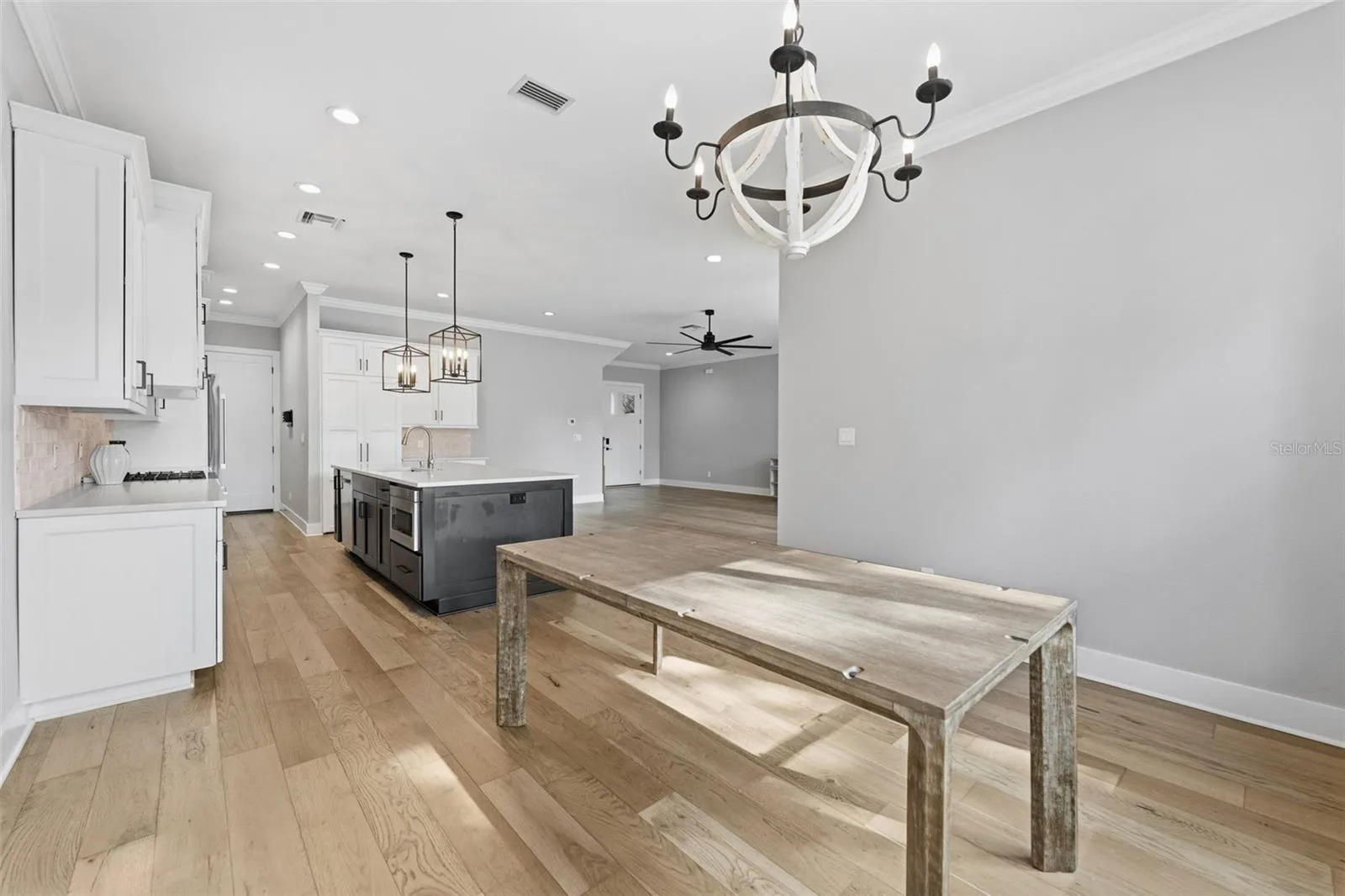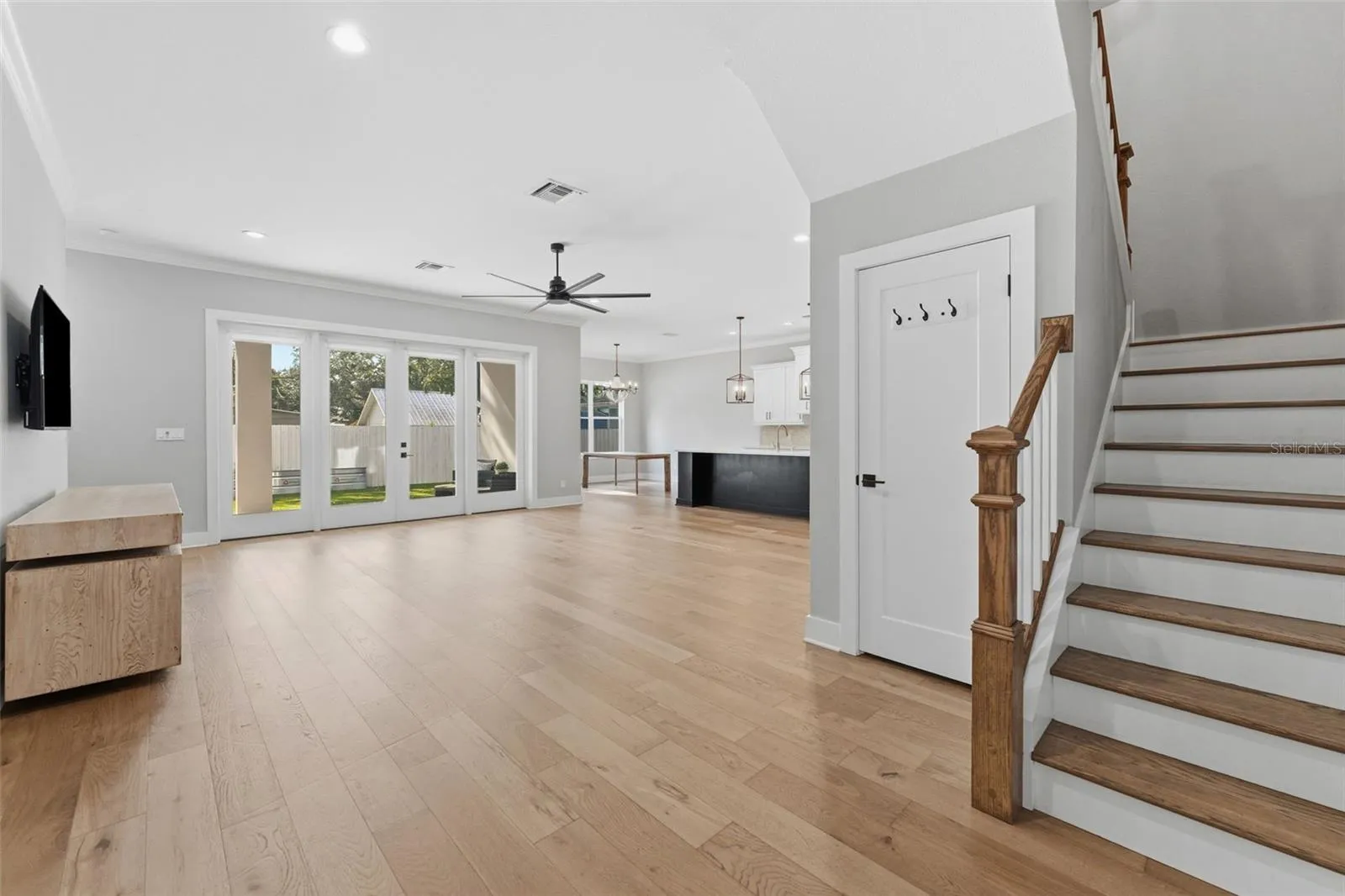 The heart of the home is a gourmet kitchen designed for both entertaining and everyday life, featuring an oversized island, stone countertops, gas range, and a hidden walk-in pantry that keeps everything beautifully out of sight. Engineered hardwood floors anchor the main living spaces, while French doors open seamlessly to the outdoors—creating true indoor/outdoor living.