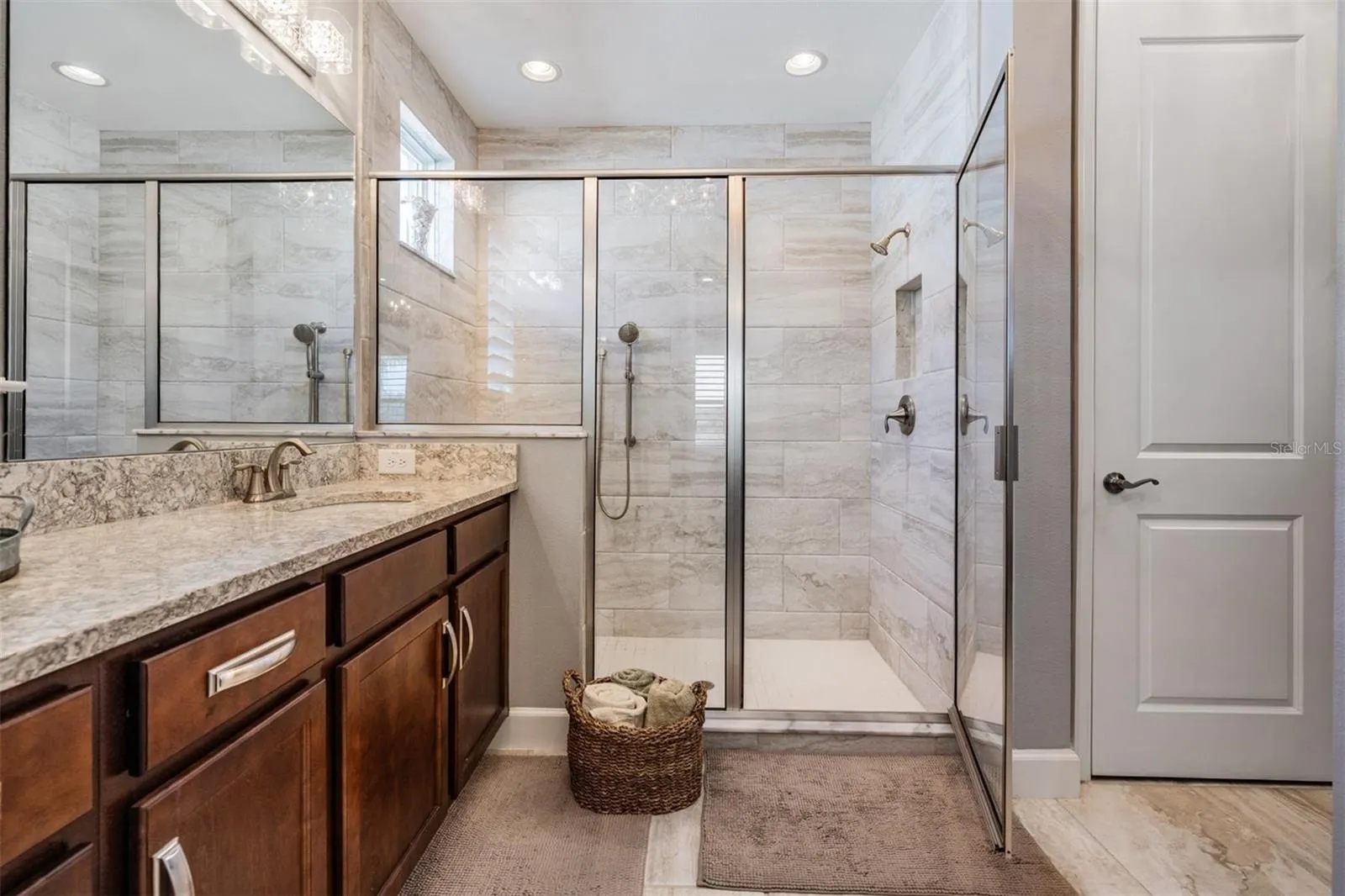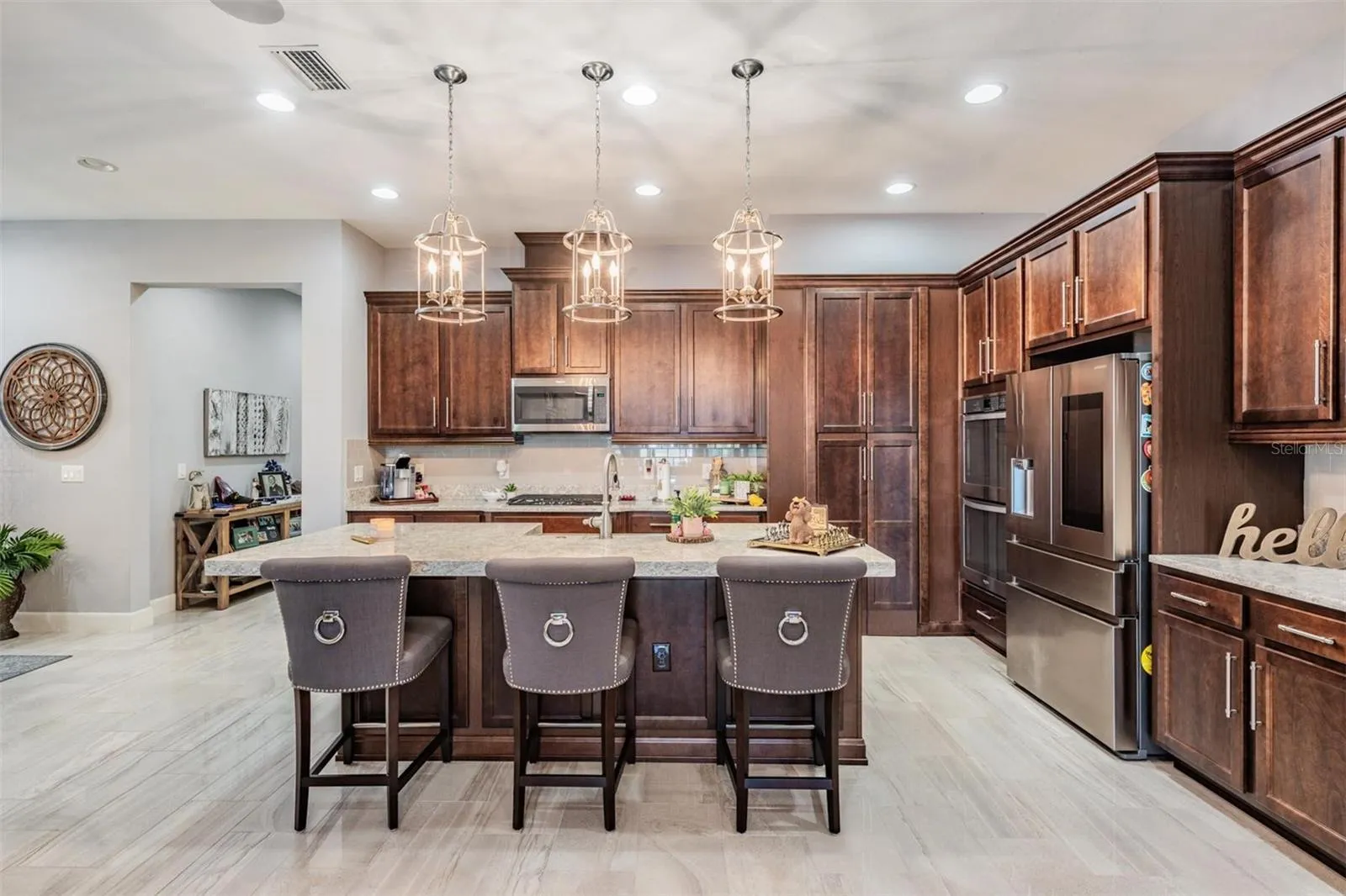 Enjoy peaceful pond views from this beautifully designed luxury villa located in the exclusive gated village of Santeri at Estancia at Wiregrass. This single-family attached home offers elegant, low-maintenance living in one of the area’s most desirable communities. The home features 2 spacious bedrooms, 2 full bathrooms, an open living and dining area, and a large two-car garage. Designed for ease and comfort, the maintenance free HOA includes lawn care, roof replacement, exterior paint, and trash service. An open-concept layout seamlessly connects the kitchen, dining, and living areas, creating a welcoming space for entertaining or relaxing. High ceilings and refined finishes enhance the home, kitchen, living area, dining room, and bedrooms. The kitchen offers ample workspace with beautiful cabinetry, modern appliances, and a large pantry. The owner’s suite provides a serene retreat with generous space and a spa-like en-suite bathroom featuring dual vanities, a spacious walk-in shower, and a large walk-in closet with custom built-ins. Step outside to the screened-in lanai with pavers and take in the tranquil pond views—perfect for enjoying your morning coffee or hosting friends and family. Residents of Santeri enjoy exclusive access to a private pool, hot tub, and dog park. The greater Estancia community offers resort-style amenities including a 7,000-square-foot clubhouse, fitness center, resort pool, parks, playgrounds, walking trails, tennis courts, basketball courts, and additional dog parks. Ideally located near I-75 and I-275, with easy access to hospitals, shopping and popular dining and shopping. Less than 30 minutes to downtown Tampa, approximately 45 minutes to award-winning beaches, and just over an hour to Orlando and Disney attractions. This home is a must-see, schedule your private showing today.