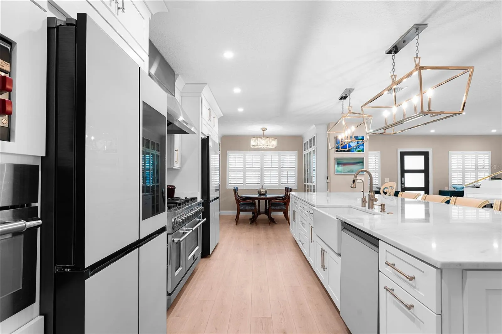 Designed for both everyday living and large-scale entertaining, the home features a spacious, open-concept floor plan anchored by dramatic 20 feet of glass panel slider doors that open seamlessly to the rear porch and resort-style courtyard. At the heart of the home is a gourmet entertainer’s kitchen, outfitted with a 48” gas range with 8 burners, dual full-size refrigerators, and a massive center island – ideal for hosting family and friends after a day at the beach.