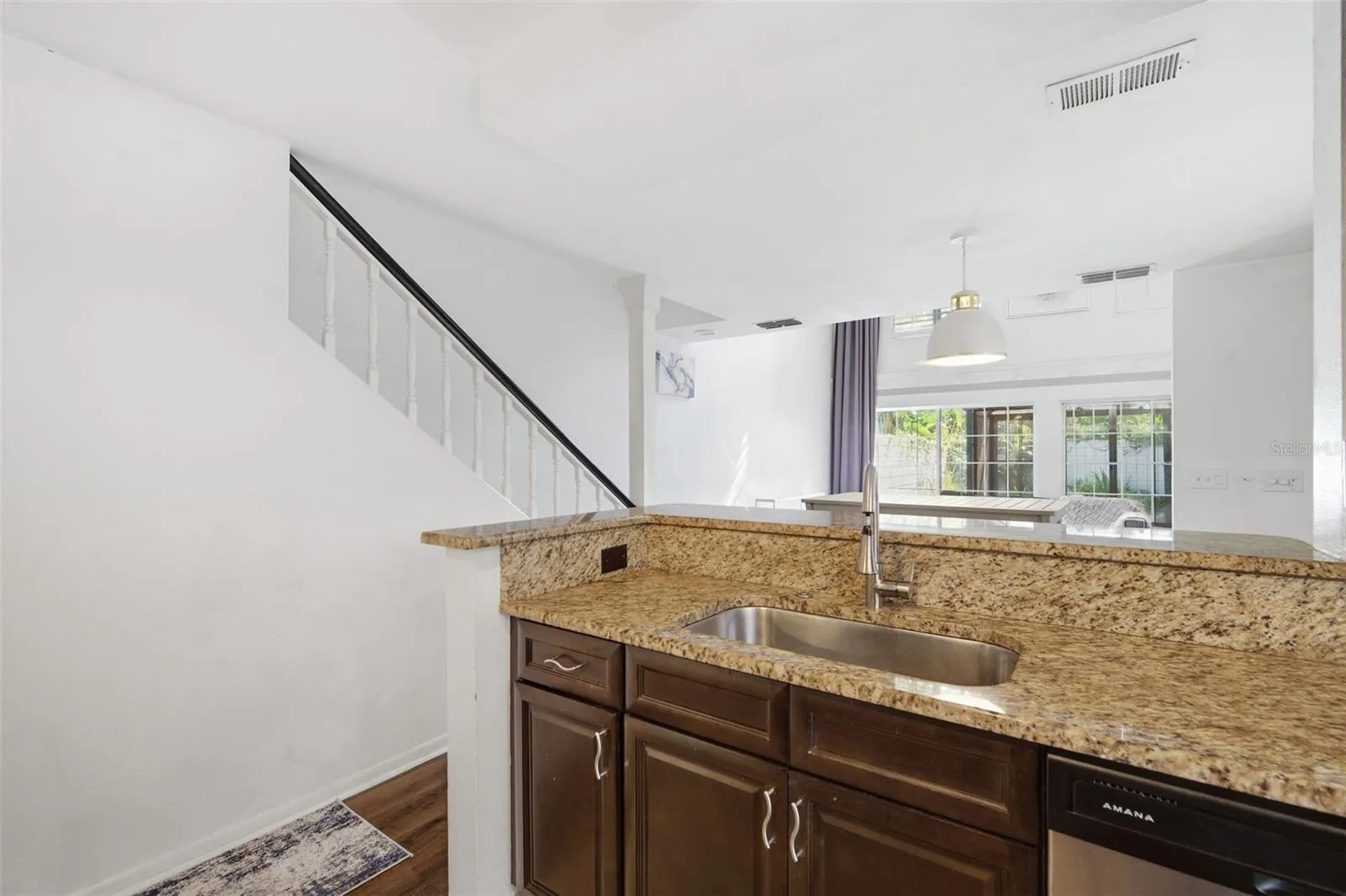 Step inside to find soaring ceilings, elegant tile flooring, and large windows that fill the home with natural light. The main level features a generous living area that flows seamlessly into the dining space—ideal for both everyday living and entertaining guests. The kitchen is the true centerpiece, featuring sleek, modern appliances including a dishwasher, microwave, and electric range, along with ample cabinet and counter space so meal prep is effortless while still staying connected to the rest of the home.
