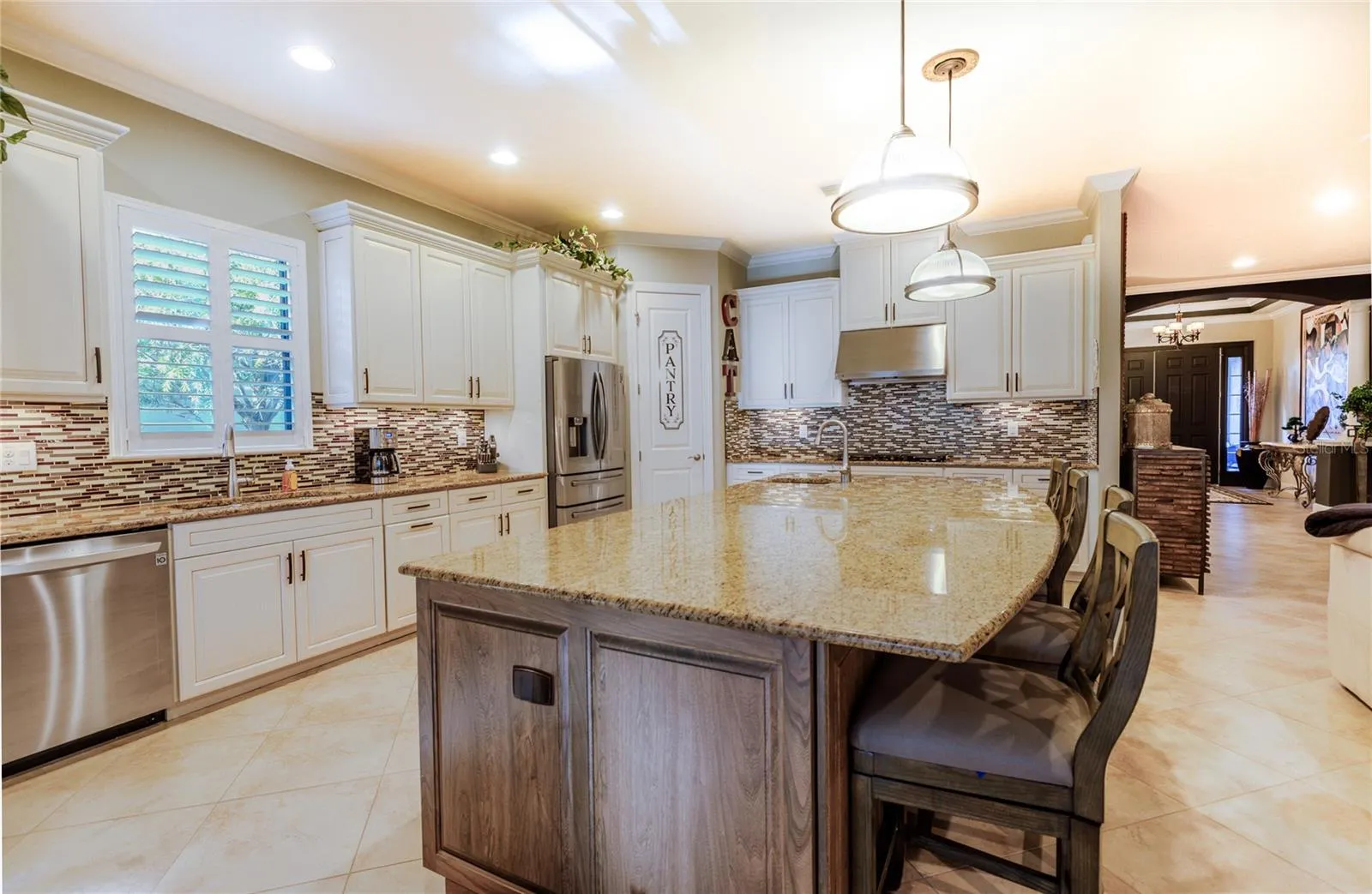- Ceiling Fans(s), Crown Molding, Open Floorplan, Walk-In Closet(s), Living Room/Dining Room Combo, Eat-in Kitchen, Kitchen/Family Room Combo, Primary Bedroom Main Floor, Split Bedroom, Window Treatments, High Ceilings, Stone Counters, Solid Wood Cabinets, Tray Ceiling(s), Coffered Ceiling(s)