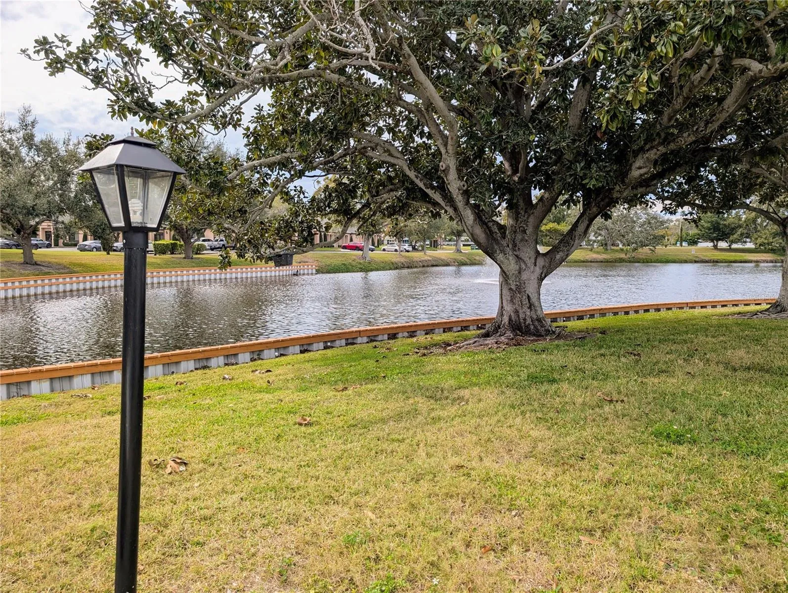 The bedroom provides direct access to a large private lanai overlooking a serene pond and fountain—an ideal setting to enjoy morning coffee or evening sunsets while observing local wildlife, including ducks and turtles. Walking paths throughout the community wind through beautifully landscaped grounds, enhancing the peaceful, park-like setting.