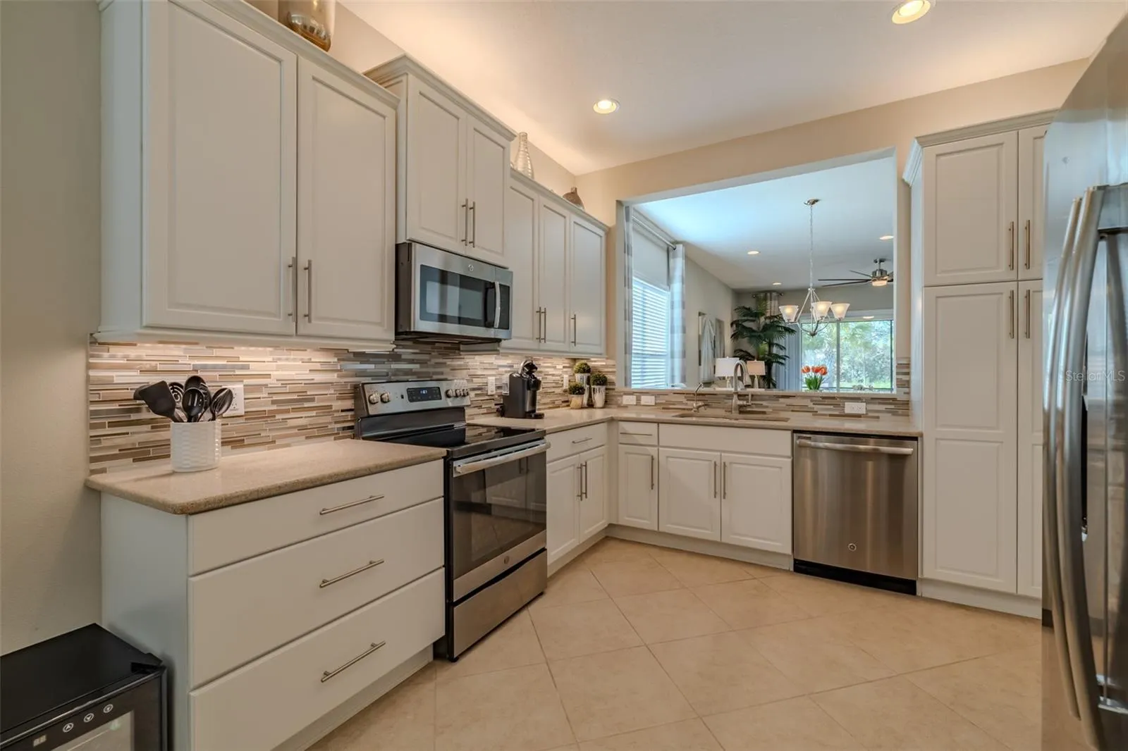 Are you ready for this? Located in Valencia Lakes, Tampa Bay’s premier 55+ Active Adult community, this beautiful CAPRI model with 1870SF, offers three bedrooms, a wonderful open floorplan with an offset water view, and it’s in pristine move-in ready condition. The screened in porch affords a great private space to relax out front and take life in stride. Solid double French doors provide wide access, when desired, to a welcoming Foyer, with its airy 13’ tray ceiling, that provides an impressive view of the open floorplan beyond. 18”x18” ceramic tile on the diagonal capped by 5 ¼” baseboards grace the floors except in two of the three bedrooms which are carpeted. Bedroom 2 is carpeted and lies at the front of the house and provides exceptional comfort and privacy and it features a Design House LEXI 52” LED ceiling fan with satin nickel finish. Bedroom 3 is centrally located in the house and has French double doors, a 6’-wide window, ceramic tile, 4 recessed lights, and a Generation Lighting DISCUS CLASSIC 52” LED ceiling fan. Bedroom 3 also has a closet, but you might decide to use this space as an Office or a Den. Having options is always good, right? The carpeted Primary Bedroom with its 10’-11’ tray ceiling is very generously sized, and its 9’-wide window provides abundant natural light and stunning sunset views. Beyond the two walk-in closets is a beautiful Ensuite Bathroom with two separated quartz vanities, a large walk-in shower with a privacy glass window, and a Water Closet for the commode. The Kitchen is well appointed with a 4’-wide cabinet Pantry with four sliding shelves, GE Profile Stainless Steel appliances, a double sink with a Reverse-Osmosis faucet, solid wood cabinetry including three pot drawers, and substantial oatmeal quartz counters capped by a gorgeous mosaic glass backsplash. And, this Kitchen is big enough for the Sous-Chef too. The adjoining Dinette will be the perfect space for daily or intimate meals. Forward of the Kitchen is a Dining Room that will comfortably accommodate 10 persons. The Great Room anchors the home, and it features a Matrix DÉCOR 72” brushed chrome ceiling fan and 12’ sliders lead to the Lanai. It’s spacious, bright and comfortable. The screened-in Lanai is a great space for outdoor living with its secluded location and beautiful offset water view. The 20’x20’ garage features luxury epoxy floors, two 4’x8’ overhead storage racks, and a Culligan Water Softener system. Accordion shutters are fitted on all windows making storm prep a breeze. Seize the day and make this CAPRI your home and begin living your idyllic life now.