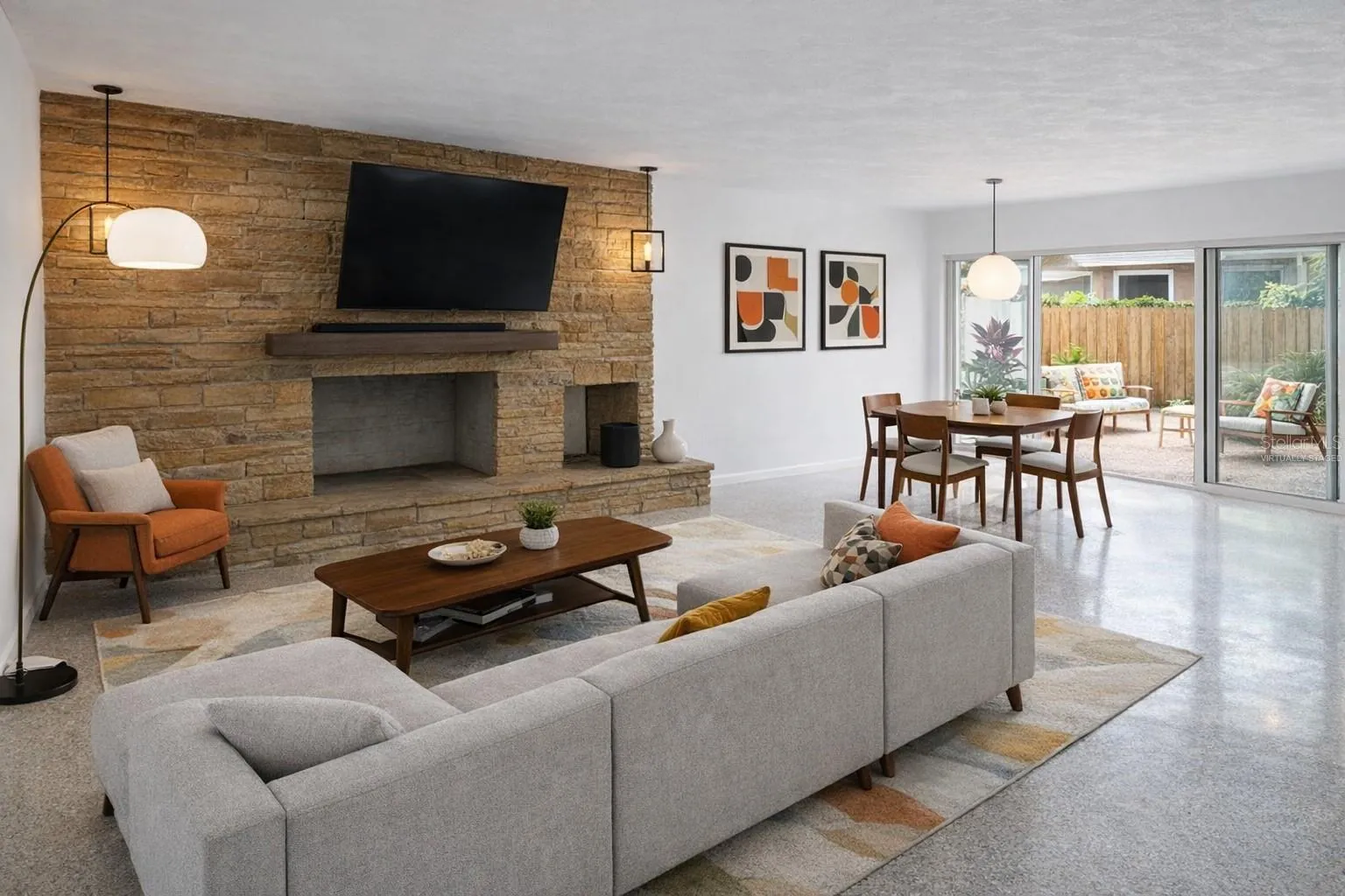 Just freshly painted with newly restored Terrazzo thoughout. The great room is anchored by a striking stone fireplace wall, creating a dramatic yet inviting focal point.