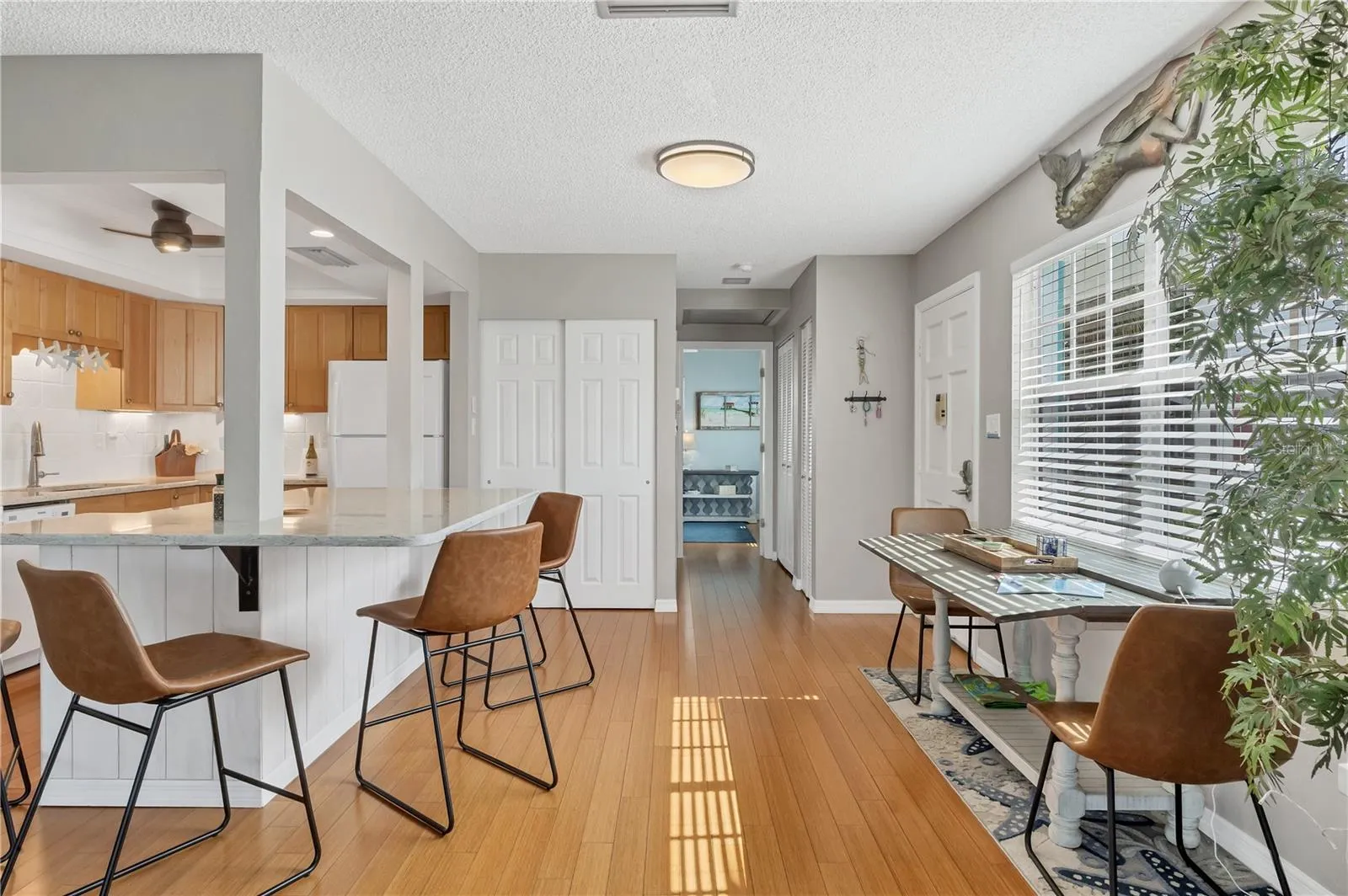 Meticulously maintained light and bright villa on one floor with an open floor plan. This one bedroom, 1 1/2 bath home is offered turnkey, including all furnishings and kitchenware. A wall of windows in the great room lets iin an Bundance of natural light, and there’s a hidden Murphy Bed adjacent to the wall for your over night guests! The recently updated eat in kitchen offers solid wood cabinets, beautiful solid surface counter tops, and creative seating possibilities for up to 8. Step beyond the whimsical guest bathroom and into the large Master Bedroom where you’ll find a walk in closet and a pocket door leading to the ensuite bathroom.