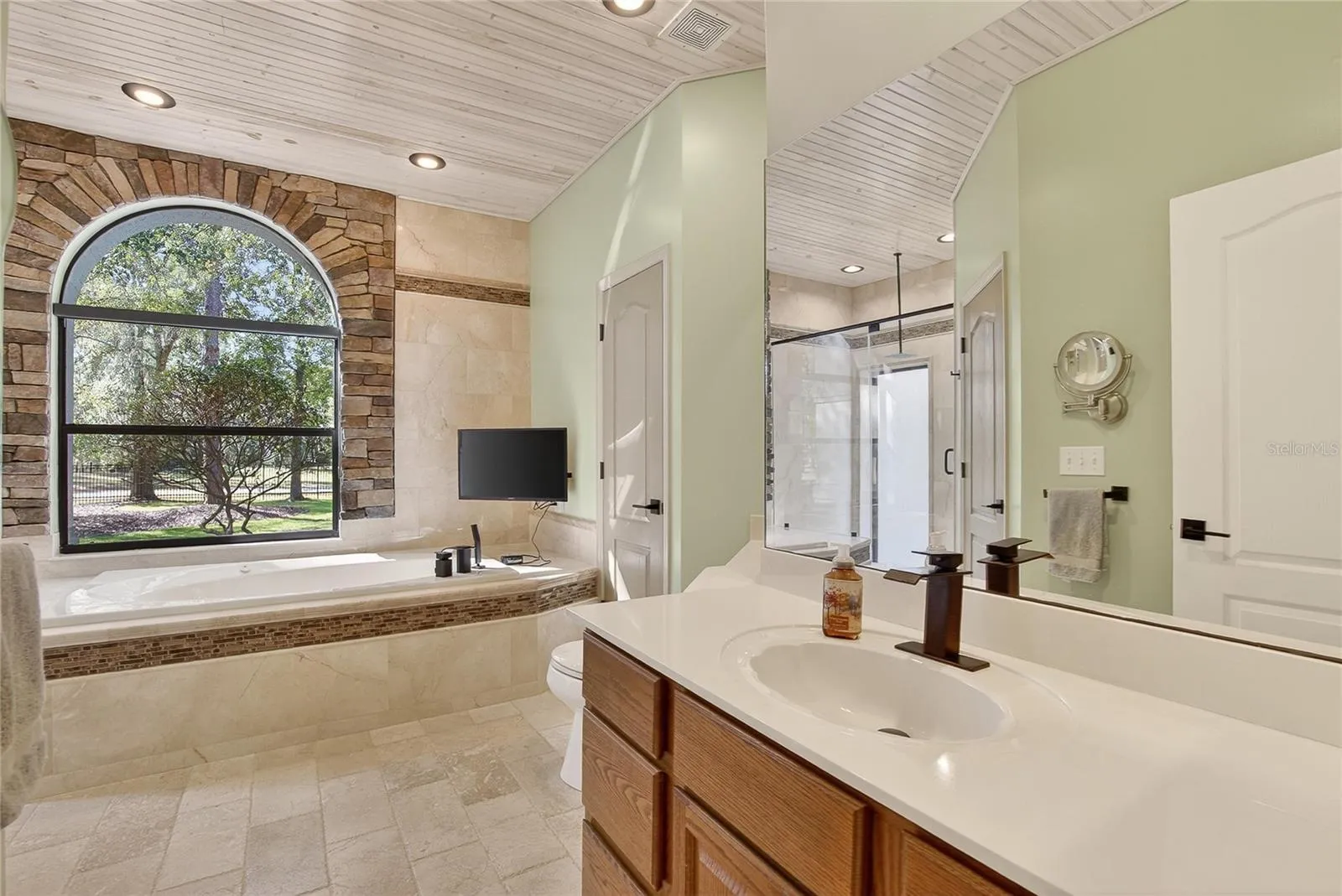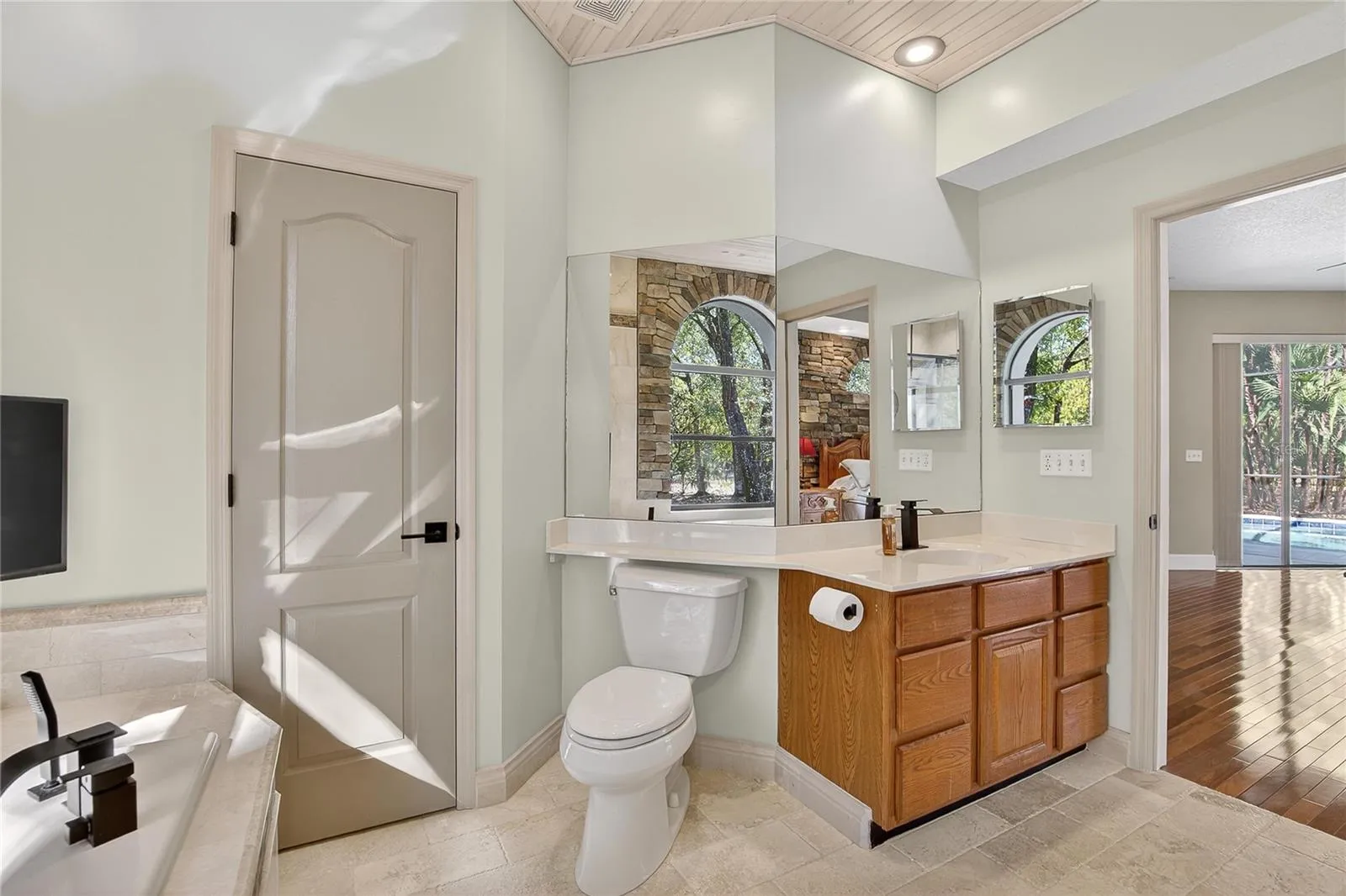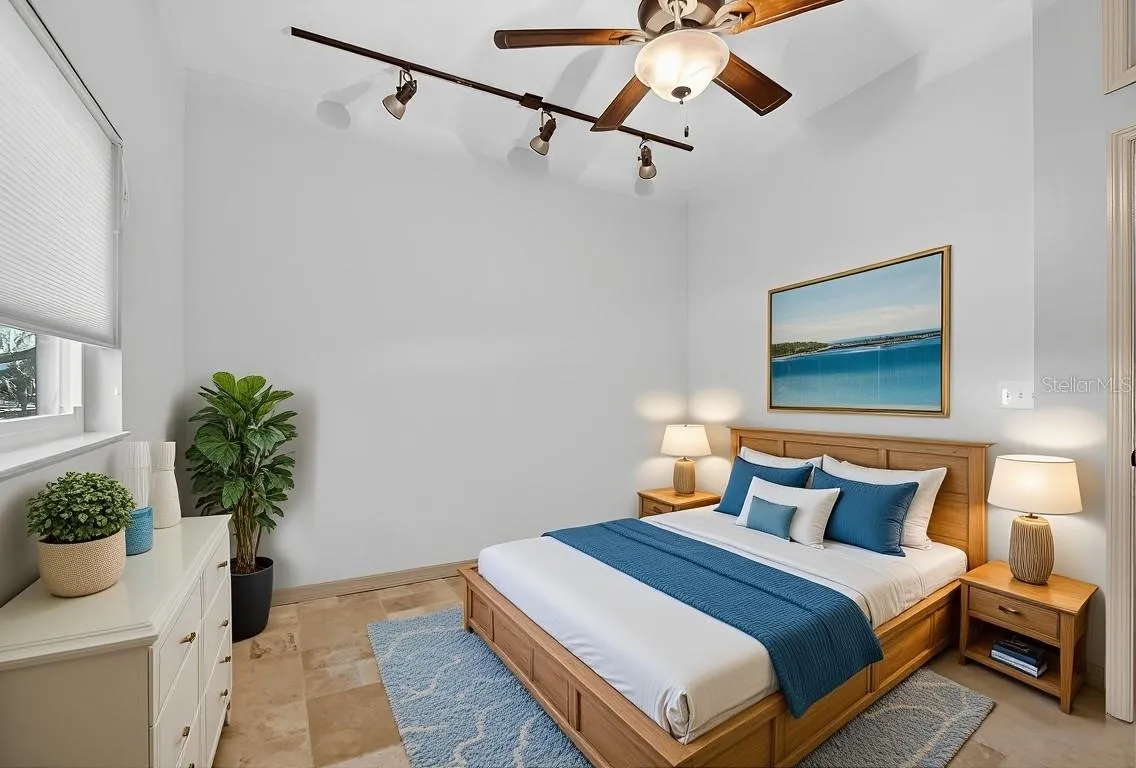 The private primary suite features sliding glass doors to the pool, serene views, a spa-inspired marble & stone bath, & a spacious walk-in closet. Two additional bedrooms & a secondary bath are on the opposite side, with a fourth bedroom ideal for an office or guest suite.