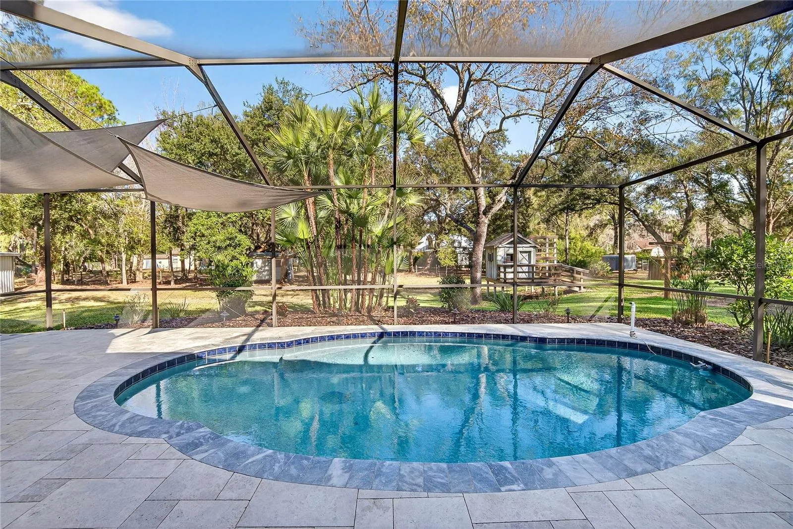 Outdoor living rivals that of a private resort with a newly remodeled saltwater pool & patio featuring leathered marble pavers, a fully fenced yard, insulated playhouse with electricity, storage shed, potting shed with water & power, landscape lighting, & irrigation on well.