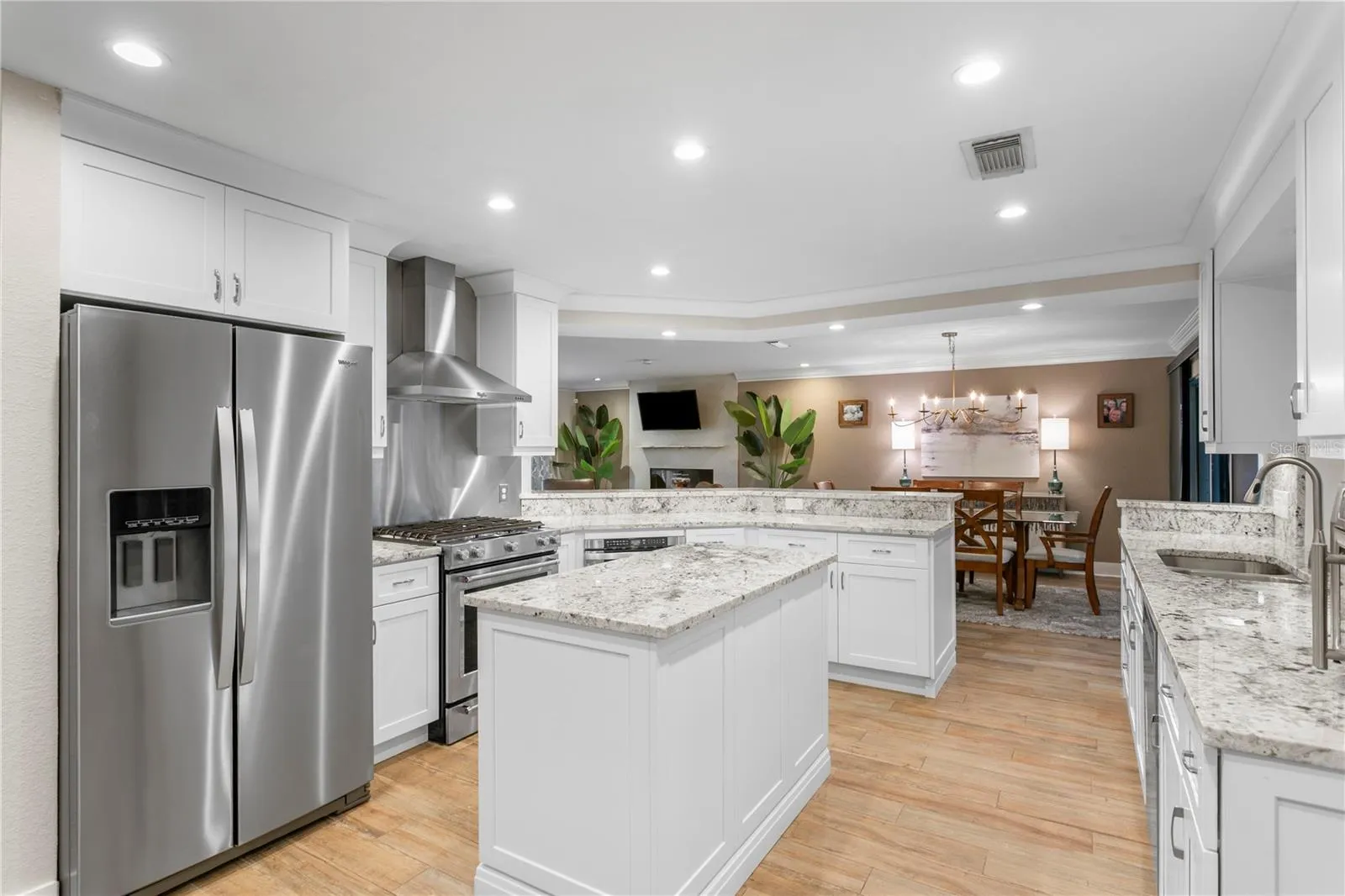 The kitchen truly is the heart of the home, featuring white shaker cabinetry, STYRATEGIC TASK LIGHTING, upscale stone counters, stainless appliances, counter seating, and a VERSITILE ISLAND. When it’s time to unwind, the spacious family room offers the perfect spot to watch the game, complete with a custom entertainment bar, beverage fridge, ONYX COUNTER, and festive lighting.
