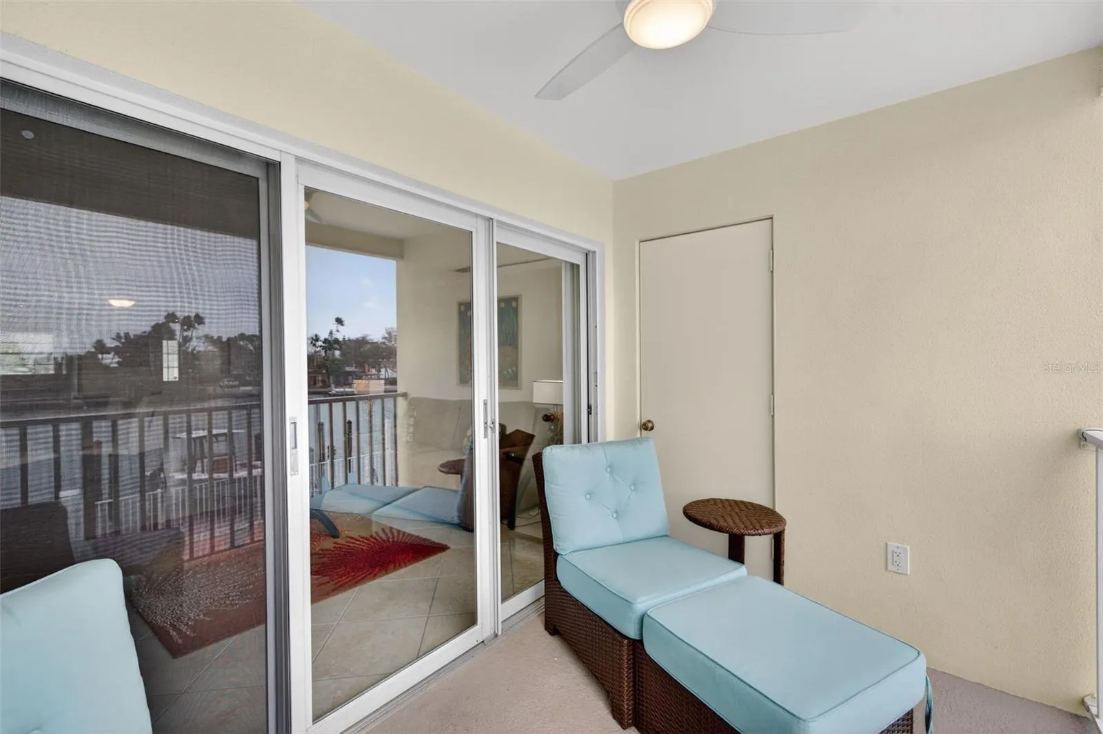 The upgraded kitchen anchors the space, featuring warm wood cabinetry, granite countertops, stainless steel appliances, and abundant storage. Living and dining areas open effortlessly to a private balcony through impact-rated sliding glass doors, offering an ideal spot to unwind while enjoying the waterfront setting. An exterior storage closet adds valuable space for beach essentials, fishing equipment, and outdoor gear.