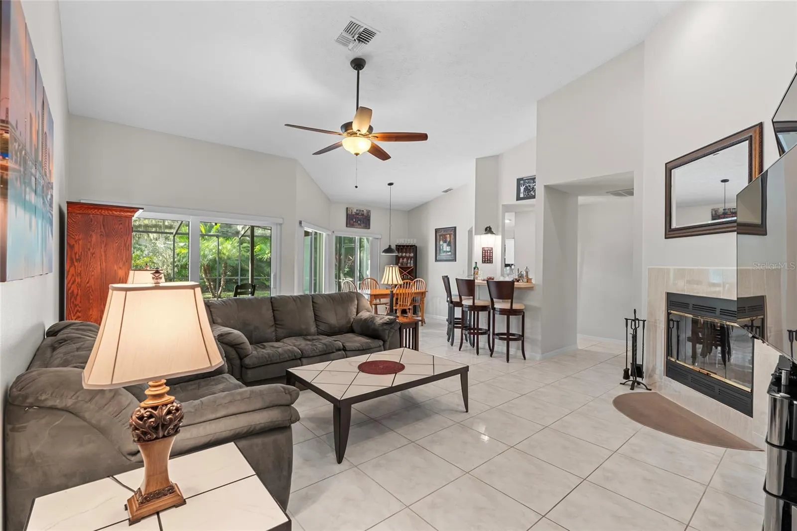 At the front entrance, you are welcomed with a beautifully and newly paved open patio. Inside, the home opens up with light and bright colors, cathedral ceilings, an open layout, and sunlight pouring in through the new 2023 HURRICANE-RATED WINDOWS and DOORS. A brand new AC was installed 2025 with UV-C germicidal lights for better air quality. The spacious living room features a convenient wet bar and a charming wood-burning fireplace, creating the perfect backdrop for a tailgate party, dinner event or just a relaxing evening entertaining friends and family.