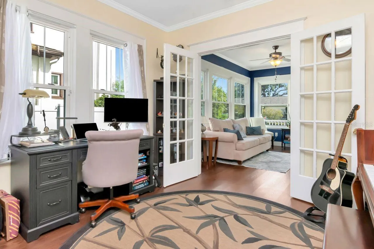 Step into a perfect blend of South Tampa charm and contemporary refinement. From the inviting front porch of this Craftsman-inspired home—with its strong horizontal profile, tapered brick piers, “bungalow meets modern addition” feel—you immediately sense a graceful balance of heritage and upgrade. The covered porch welcomes guests into the heart of this residence. On the inside, the main level opens with wide oak plank flooring, 9-foot ceilings, and a natural light stream through tall windows. A formal living room anchors the home with a stylish wood-burning fireplace and custom mantle, while adjacent you’ll find a sunroom filled with light and a formal dining area ideal for entertaining. The kitchen was designed with thoughtfulness and style: a center island/breakfast bar, stainless-steel appliances (including an induction cooktop and built-in convection oven), and beautiful granite countertops. The kitchen flows directly into a family room that opens to the backyard patio, creating a seamless indoor/outdoor zone perfect for daily living or hosting guests. The owner’s suite is located on the main floor and delivers both comfort and elegance: dual vanities, a pedestal free standing tub, and a separate glass-enclosed shower. A flexible office/den just off the main level can serve as a guest room, home office or secondary living space. A quaint powder bath is conveniently located adjacent to the study. Upstairs, a well-lit secondary primary suite sits alongside two additional bedrooms, a full bathroom and a convenient upstairs laundry room — creating a thoughtful layout for family or visiting guests. Through every space, architectural details shine: crown molding, wood casings and built-ins honor the earlier bungalow character while the scale of the addition (added in 2017 to the original 1300 sqft bungalow) holds its own for modern life. With approx. 3,224 sq ft of living space, this two-level residence delivers both formal and casual zones, private and shared spaces, and a timeless palette of finishes. Outside, you’ll find a backyard sanctuary designed for both activity and relaxation. A contemporary lap pool (added in 2018) offers a clean, long swim lane and crisp resort-like edges. French doors from the family room open the house to the outdoors, reinforcing the sense of continuous living. The result is a fully fenced-in backyard retreat tailored to lifestyle. Mature landscaping and a low-maintenance lawn border the space, providing privacy and a lush backdrop. Parking and garage access are handled with the same notion of thoughtful design: there is a detached one-car garage, accessed via a long driveway and granting a separate side entry to the kitchen area for everyday ease. An electric vehicle charger is conveniently located nearby and conveys with the home. This home is truly a rare find—melding South Tampa’s street-charm, walkability, bay-close lifestyle, and contemporary amenities. From the welcoming front porch to the refreshed interior and the pool-side retreat, every detail has been sculpted for style, comfort and function. The Sellers are including a 1 year American Home Shield Warranty. You don’t want to miss this one!! Call for your private showing.