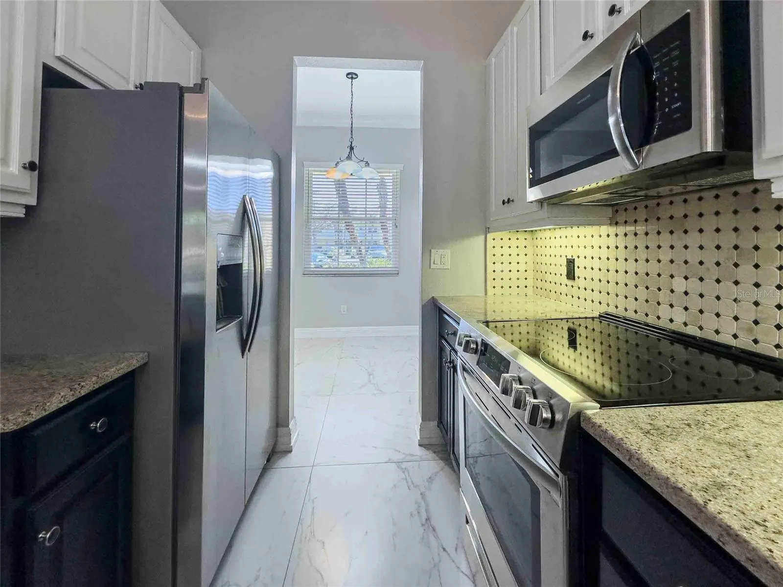 The remodeled kitchen features sleek granite countertops and stainless-steel appliances, opening into a bright, spacious living and dining area perfect for everyday living or hosting friends. Large Weather Tite high-efficiency, double-pane windows and sliders fill the home with natural light while improving energy efficiency throughout.