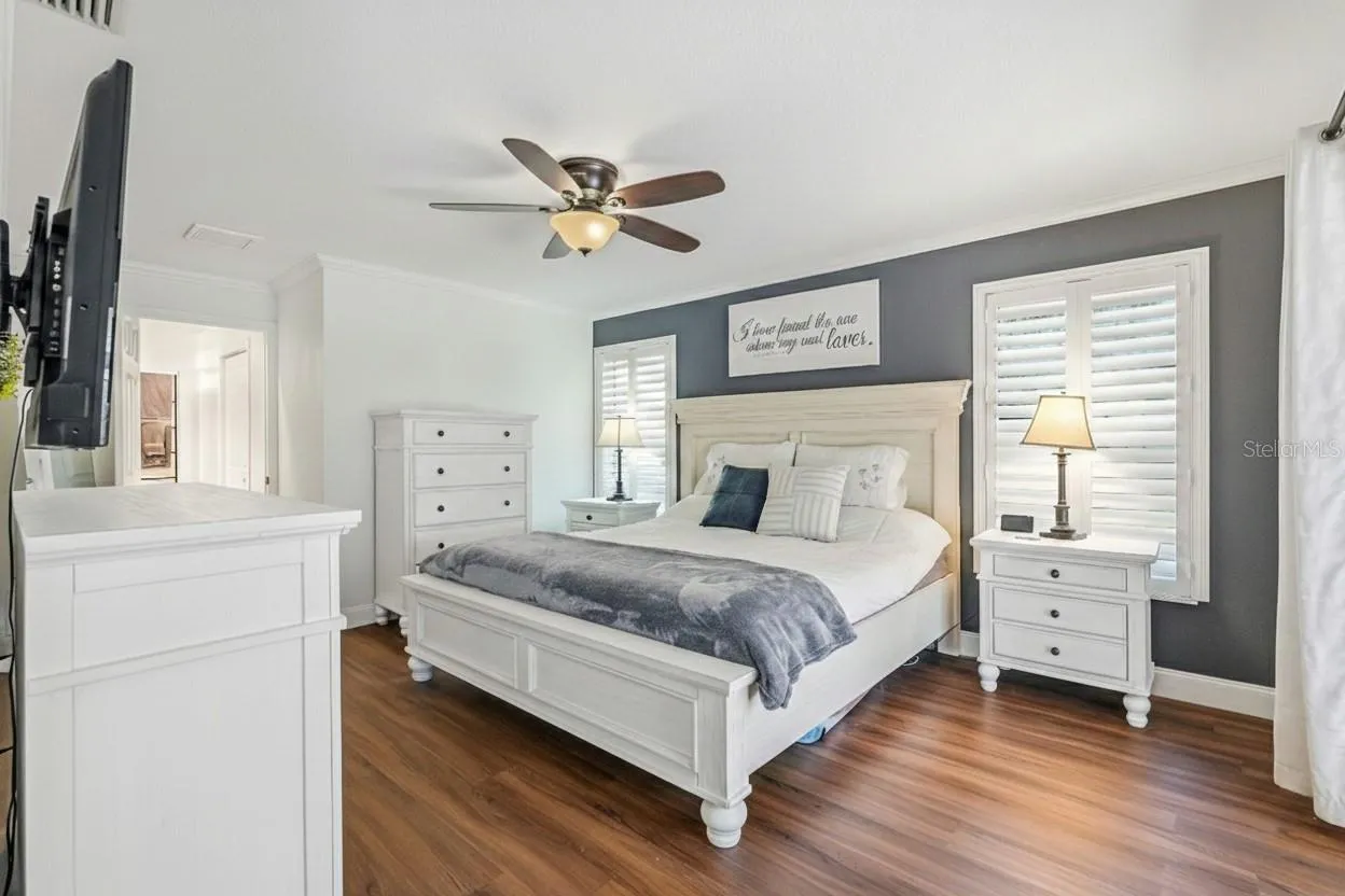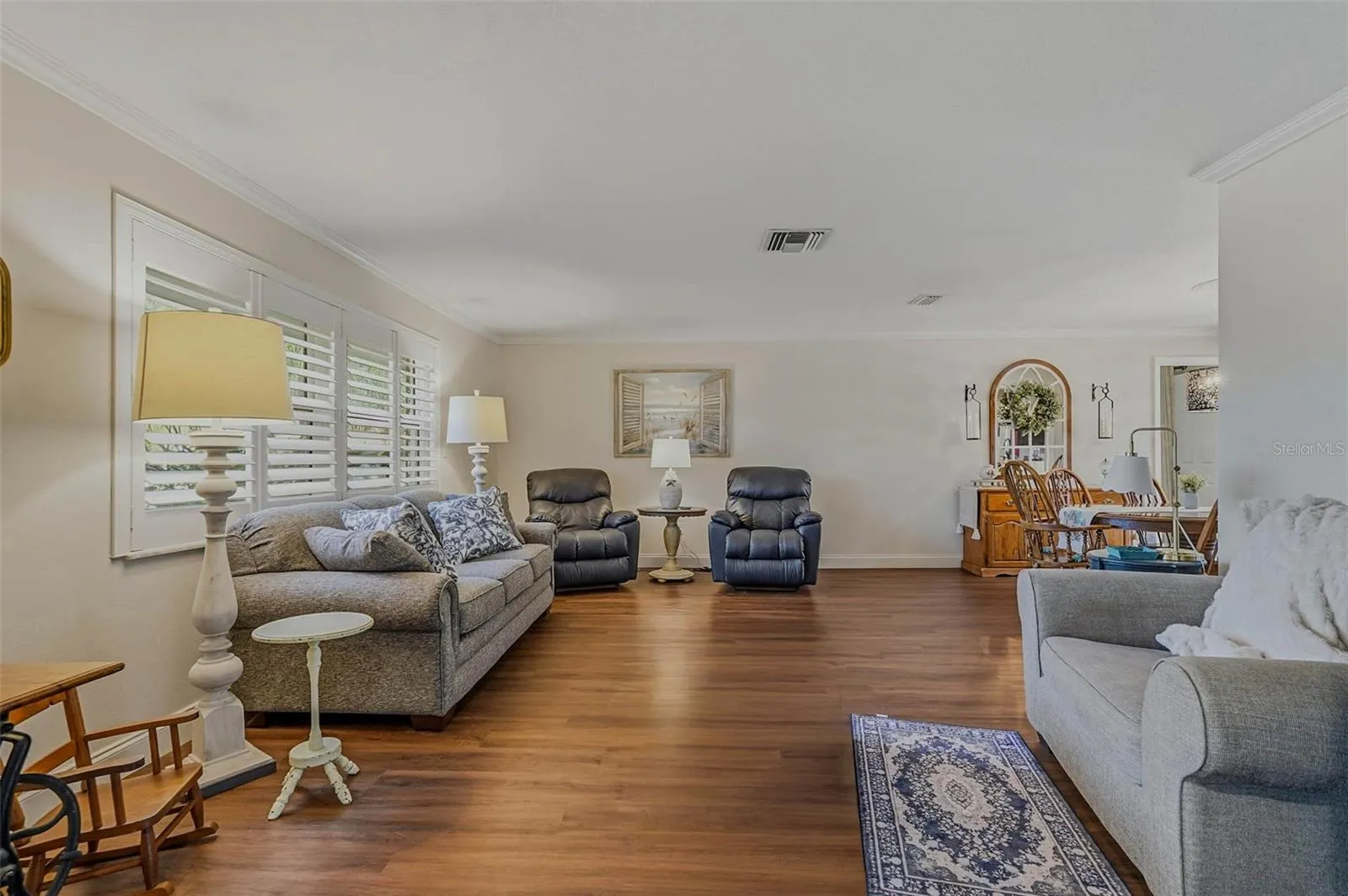 From the moment you step inside, the open and flowing floor plan feels spacious, bright, and welcoming. Natural light fills the living and dining areas, highlighting durable flooring, crown molding, and plantation shutters throughout. The seamless layout creates an ideal environment for both everyday living and effortless entertaining.