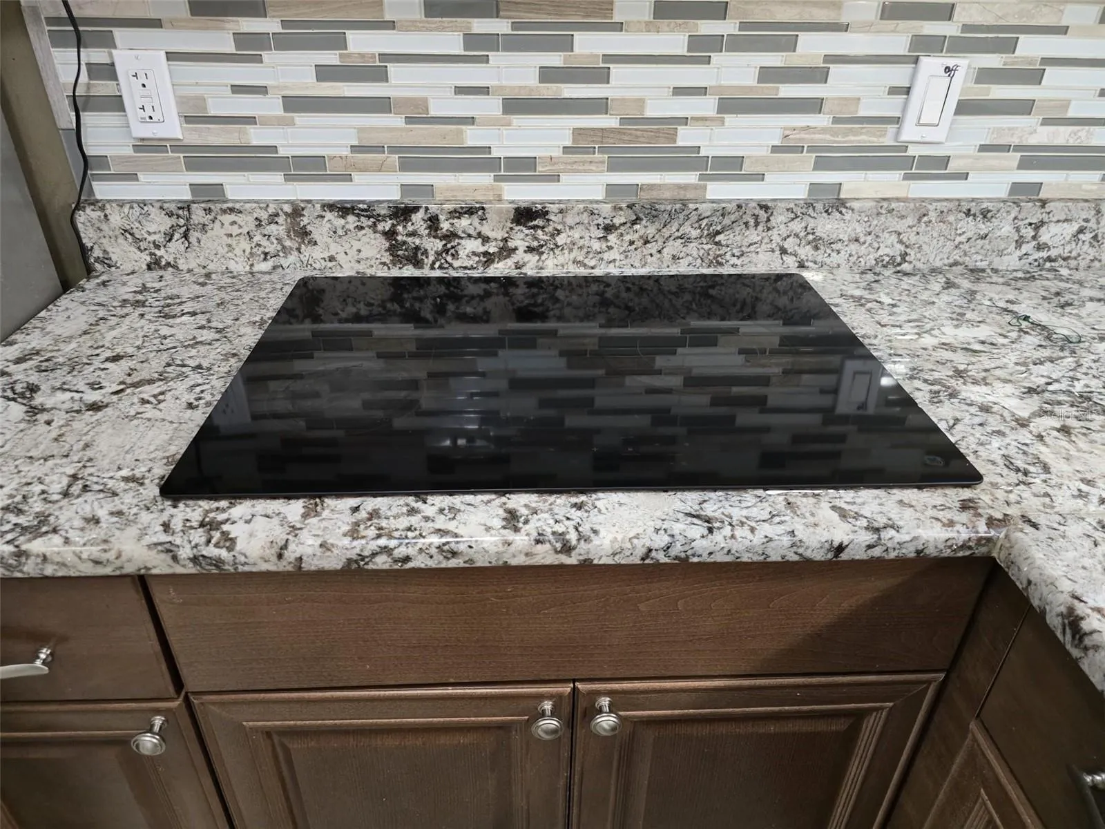 The entry opens to an updated kitchen equipped with granite countertops, stainless steel appliances, an induction cooktop, pantry storage, and an adjacent laundry room with Samsung energy-efficient washer and dryer. The kitchen overlooks a spacious combined living and dining area, ideal for everyday living and entertaining.
