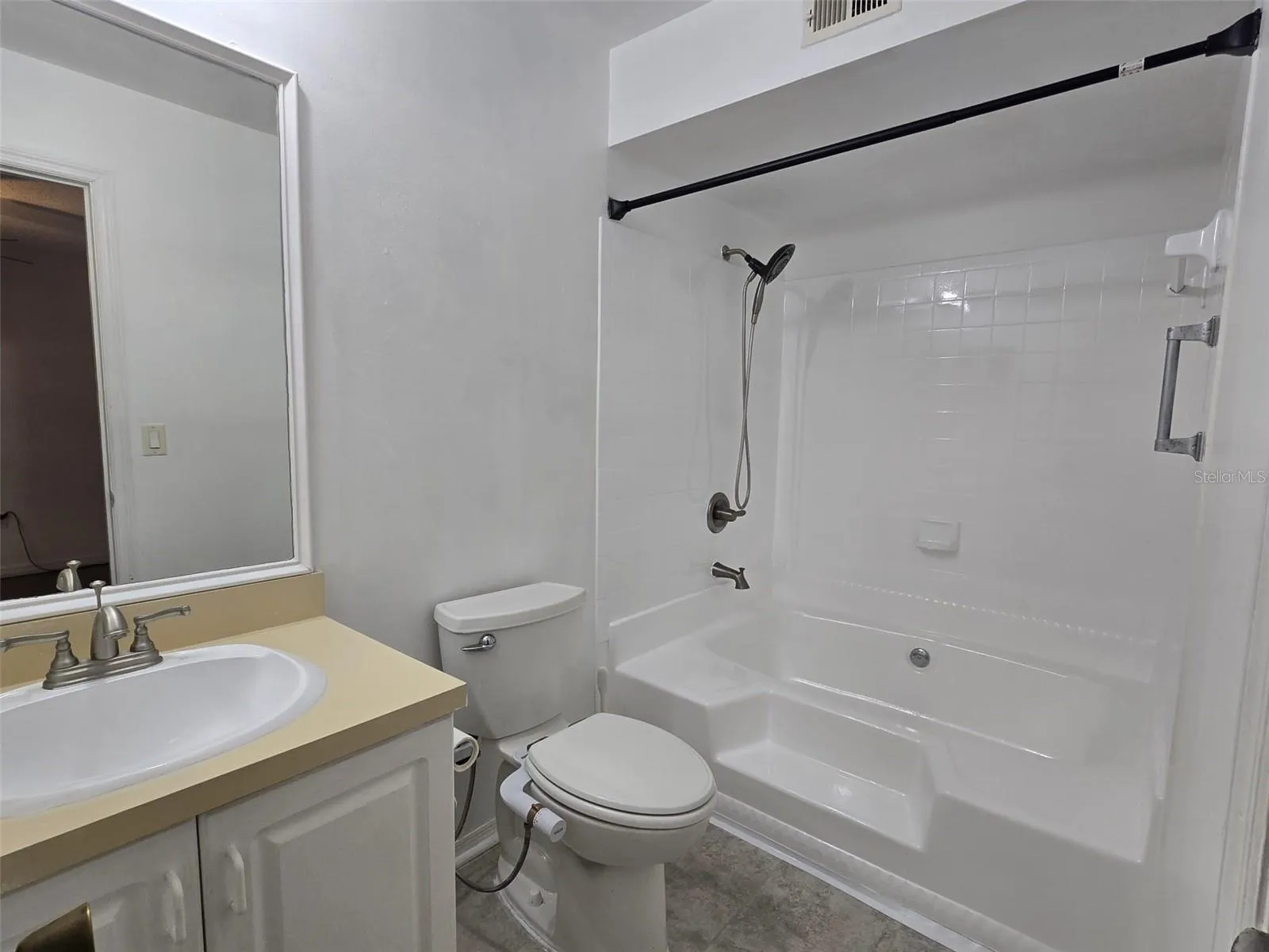 The split bedroom floor plan offers privacy, with two generously sized bedrooms, both featuring walk-in closets. The primary bedroom includes an ensuite bath, while the second bathroom is conveniently located near the guest bedroom and entry. Both bathrooms have been recently refreshed with new flooring and refinished tub and shower surfaces.