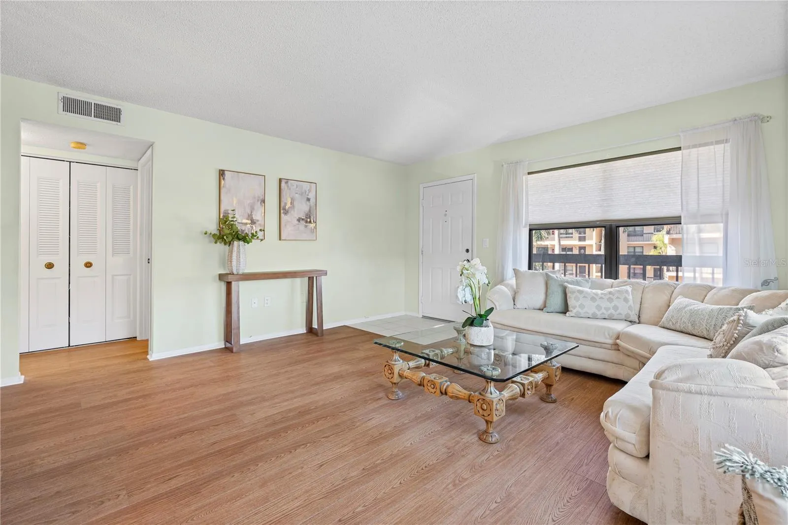 Welcome to easy, low-maintenance living in this gated 55+ community centrally located in the heart of Bradenton. This is the largest available floor plan at 1,144sf offering 2 bedrooms, 2 bathrooms and two light-filled living spaces designed for comfort and simplicity. Inside, you’ll immediately notice the new wood laminate flooring throughout (no carpet anywhere) paired with an updated kitchen that flows effortlessly into the main living area. The spacious layout is ideal for entertaining or relaxing at home. Enjoy tranquil pond views overlooking a walking trail and park-like green space, perfect for morning strolls or unwinding at the end of the day. The washer and dryer are conveniently located in the unit, and the building features an elevator for easy access. This well-maintained community offers fantastic amenities, including a clubhouse and pool, and the monthly fee includes cable TV, water, sewer, and on-site management, making budgeting simple and stress-free. Additional perks include covered parking and a private storage locker. Pets are welcome (one dog up to 25 lbs or two cats), and the location places you close to shopping, dining, medical facilities, and downtown Bradenton—while still enjoying the privacy of a gated community.