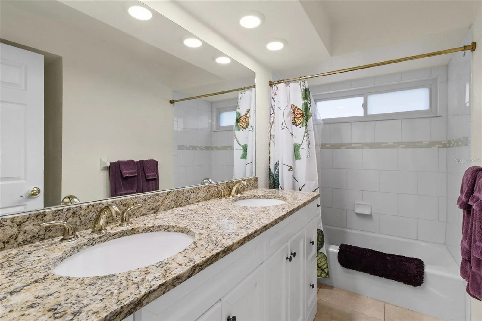 Interior highlights include plantation shutters, crown molding throughout, and granite countertops in the kitchen and both bathrooms. The updated primary bathroom offers a walk-in shower with grab bars, while the second bathroom includes dual sinks and a tub/shower combination. The kitchen is equipped with Whirlpool appliances (2023). Outdoor living is enhanced by a paver driveway, paver front and rear patios, and paver sidewalks, along with an irrigation system fed by a private well. The two-car garage includes a utility sink and a newer garage door opener.