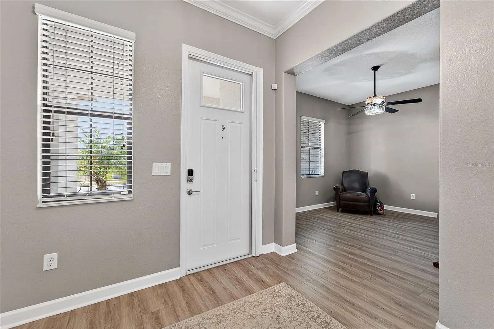 - Ceiling Fans(s), Crown Molding, Open Floorplan, Thermostat, Walk-In Closet(s), Kitchen/Family Room Combo, Window Treatments, High Ceilings, Stone Counters, Smart Home, Solid Wood Cabinets, Solid Surface Counters, In Wall Pest System, Tray Ceiling(s)