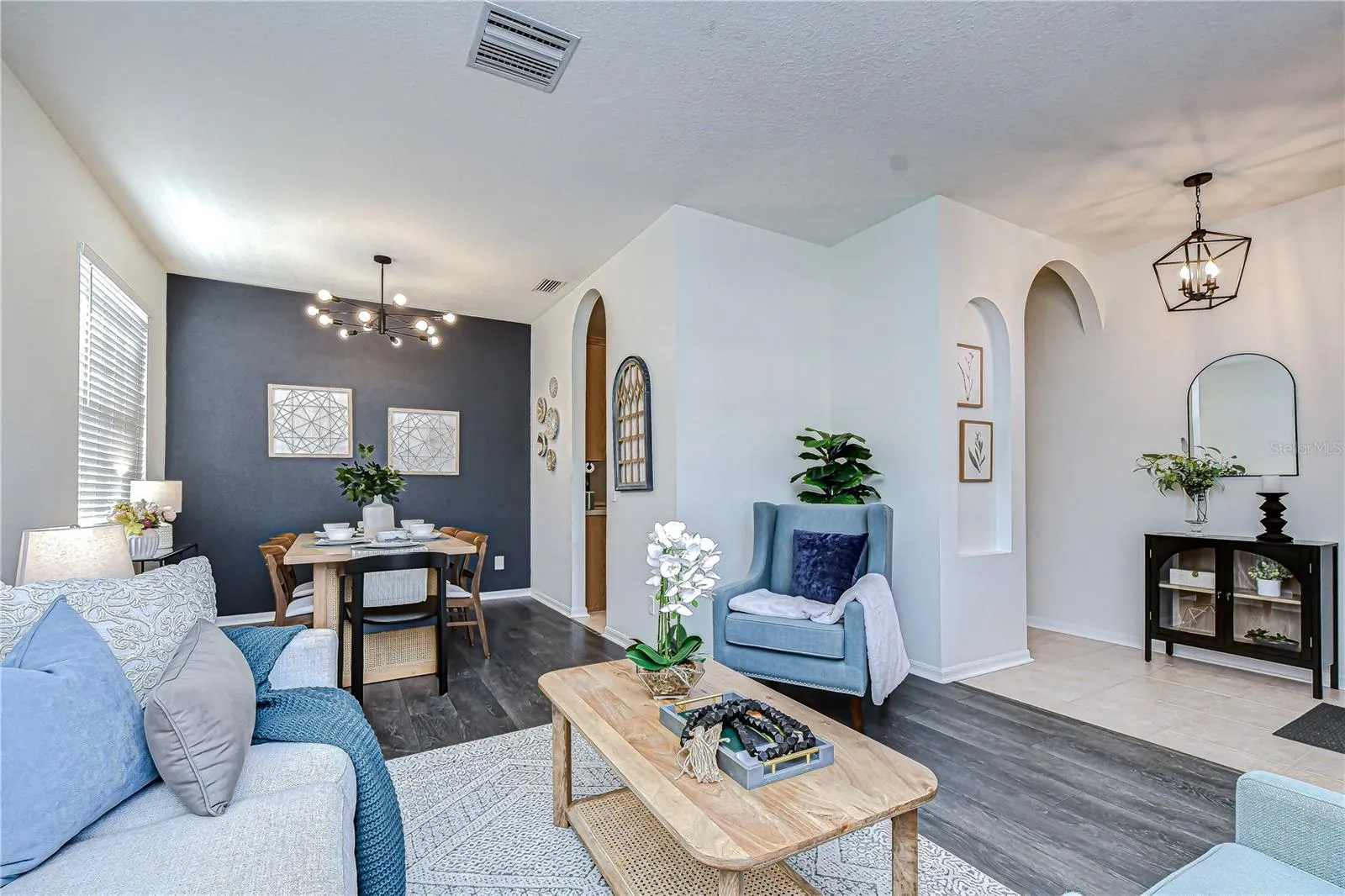 - Ceiling Fans(s), Open Floorplan, Thermostat, Walk-In Closet(s), Living Room/Dining Room Combo, Eat-in Kitchen, Kitchen/Family Room Combo, Split Bedroom, Solid Wood Cabinets, Solid Surface Counters, Built-in Features
