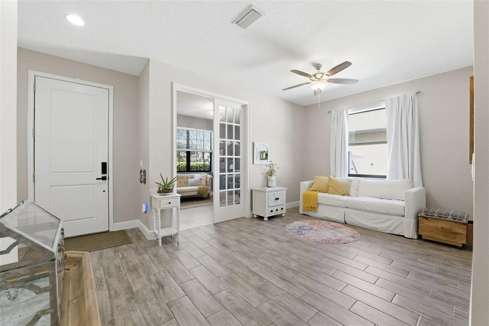 Step inside to enjoy vaulted ceilings, 9-foot doors, upgraded appliances, and elegant 42” kitchen cabinetry with crown molding. The home features porcelain wood-plank tile flooring throughout the main living areas while previously carpeted spaces have been upgraded to 24” porcelain tile, creating a cohesive, modern look .The flexible floor plan includes a private bonus room/study with glass French doors, perfect for a home office, media room, or creative space.