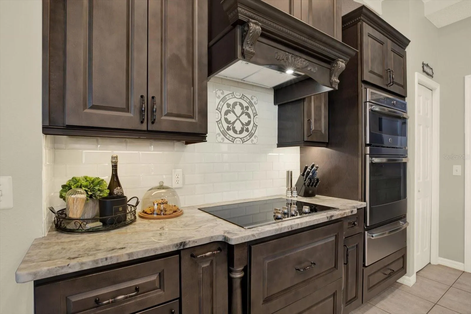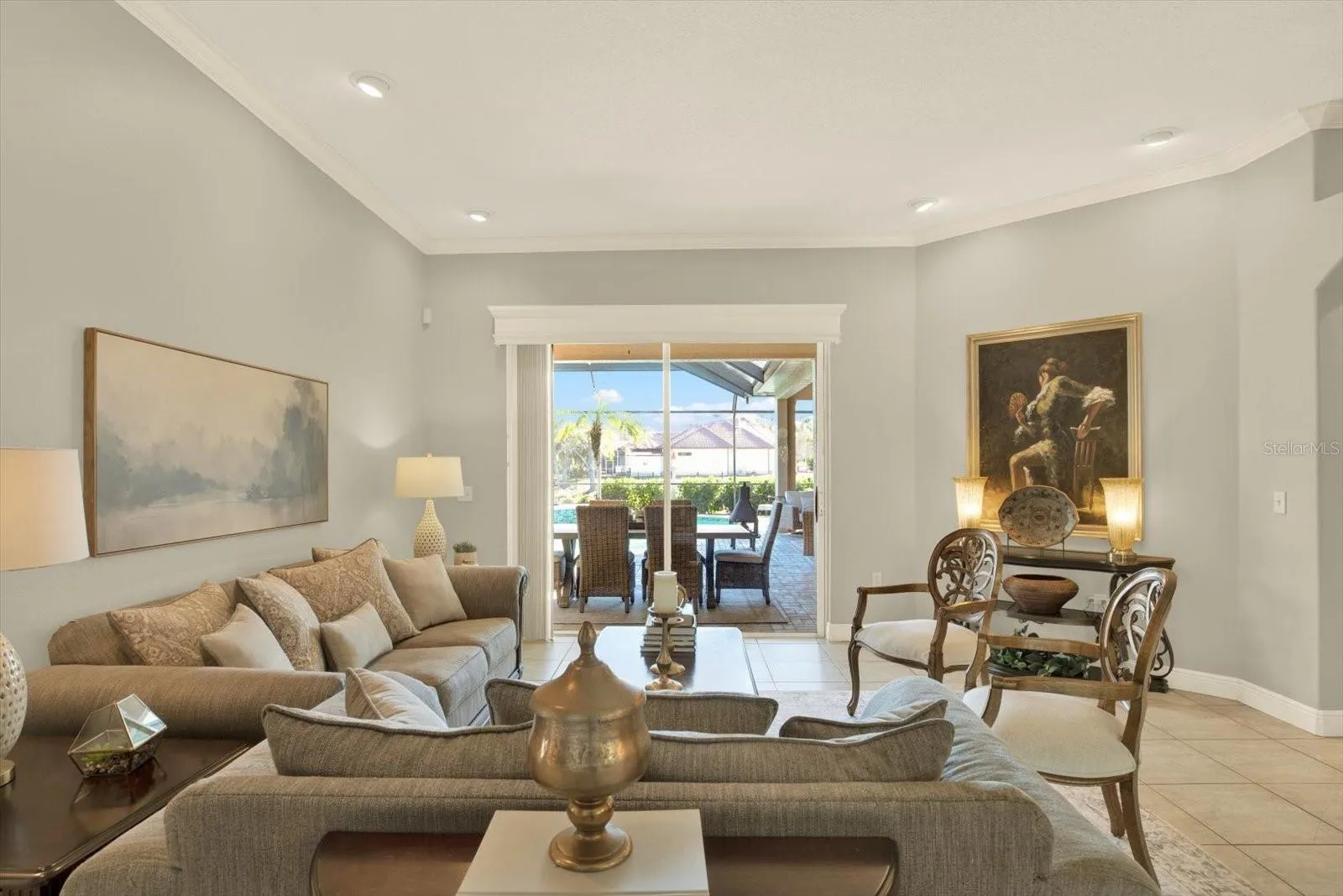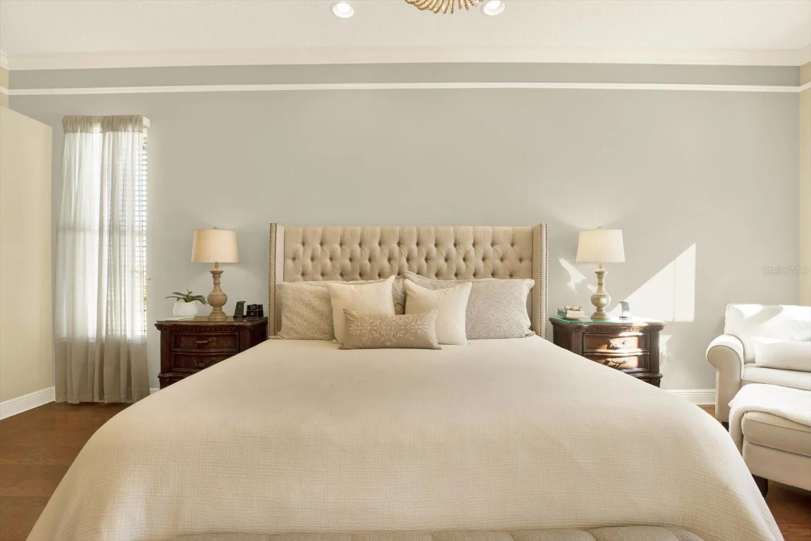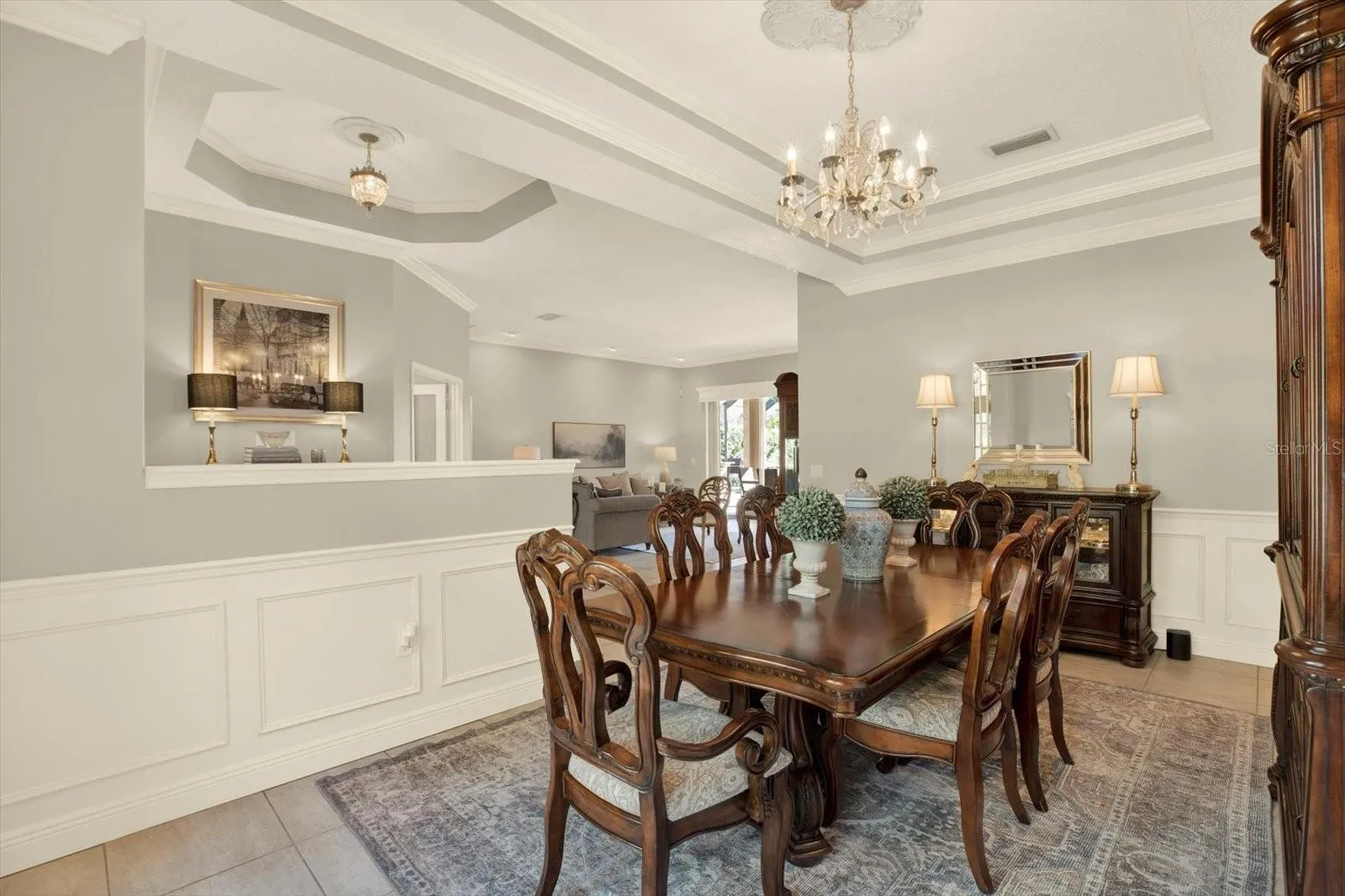 From the moment you enter, the home’s attention to detail and meticulous care are evident. From the tray ceilings in the foyer, formal dining room, and kitchen to the updated fixtures and recessed lighting, the home feels elevated throughout. The primary suite features crown molding, his and her closets, and view of the pool and lake. The ensuite bath includes a soaking tub, separate shower and double vanities with a standing tower for additional storage. Just steps away from the primary suite and formal living space is a private office, offering an ideal work from home setup. The kitchen is the heart of the home and opens seamlessly to the dining nook and family room, creating an ideal space for entertaining. Rich 42 inch walnut cabinetry offers abundant storage, complemented by a large island with seating and a secondary prep island. Stainless steel appliances, a wine fridge, and built in wine rack complete the space, while the same aesthetic continues into the laundry room turned butler pantry. The dining nook is framed by a three pane frameless window, providing unobstructed views of the outdoor living space, and the family room features an electric fireplace, humidor, and built in shelving.