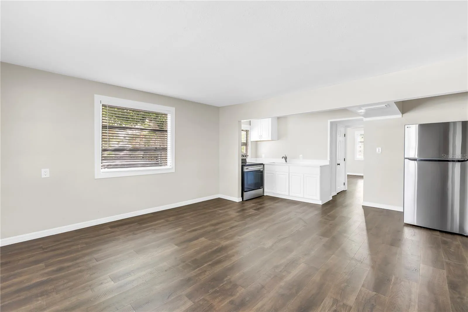 The apartment features new flooring, fresh drywall, updated appliances, and a new A/C system, creating a clean and modern living environment. The open kitchen offers stainless steel appliances and a breakfast bar, perfect for casual dining and entertaining. The bathroom has been tastefully renovated with a walk-in shower and crisp white tile finishes.