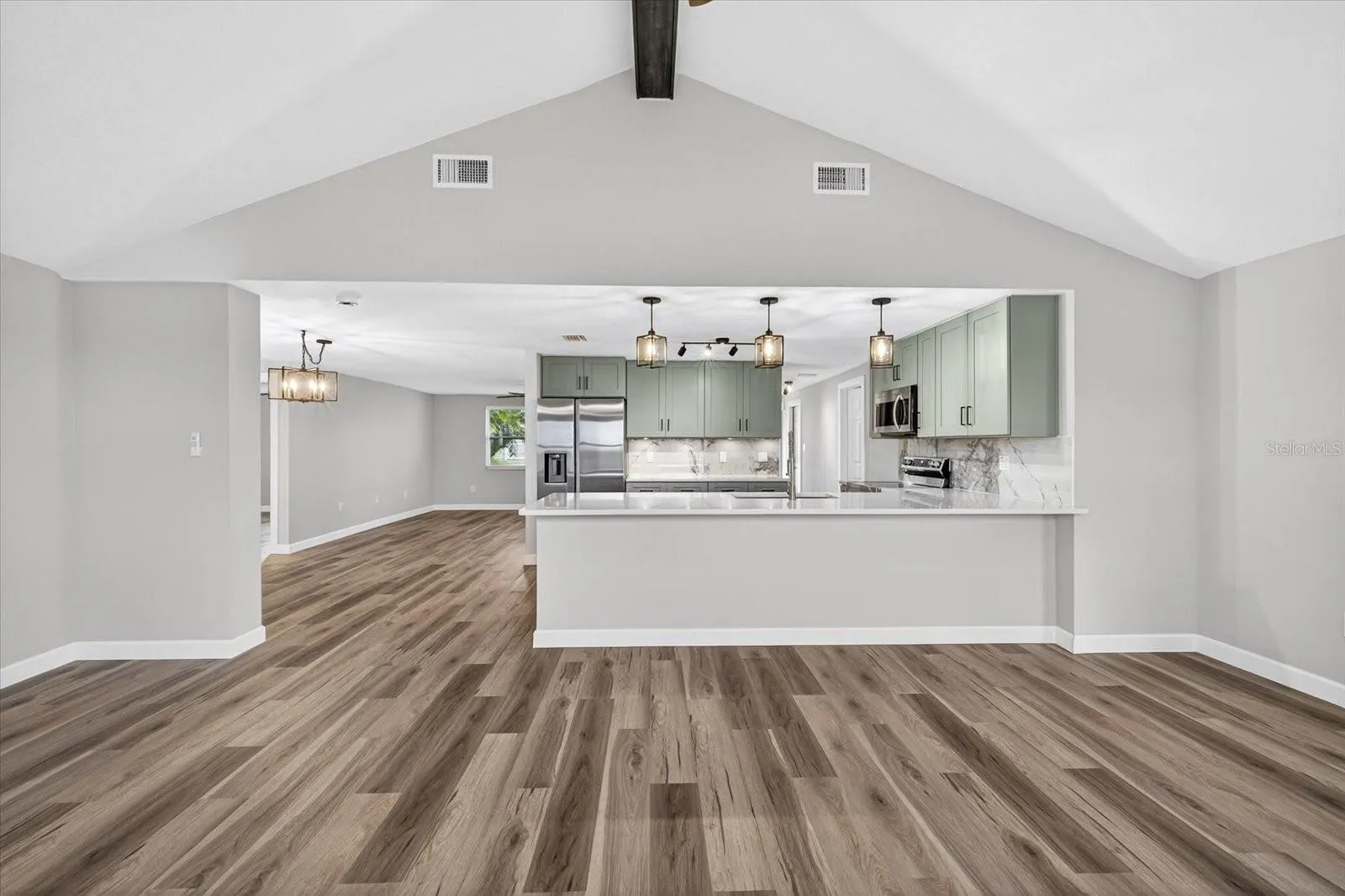 Welcome to this beautifully remodeled home located in the highly desirable Gulf Harbors community of New Port Richey. Thoughtfully updated and truly move-in ready, this residence offers a spacious open floor plan ideal for comfortable everyday living and easy entertaining. The stunning kitchen serves as the heart of the home, featuring stainless steel appliances, quartz countertops, and elegant sage shaker cabinetry that create a timeless, modern coastal feel.