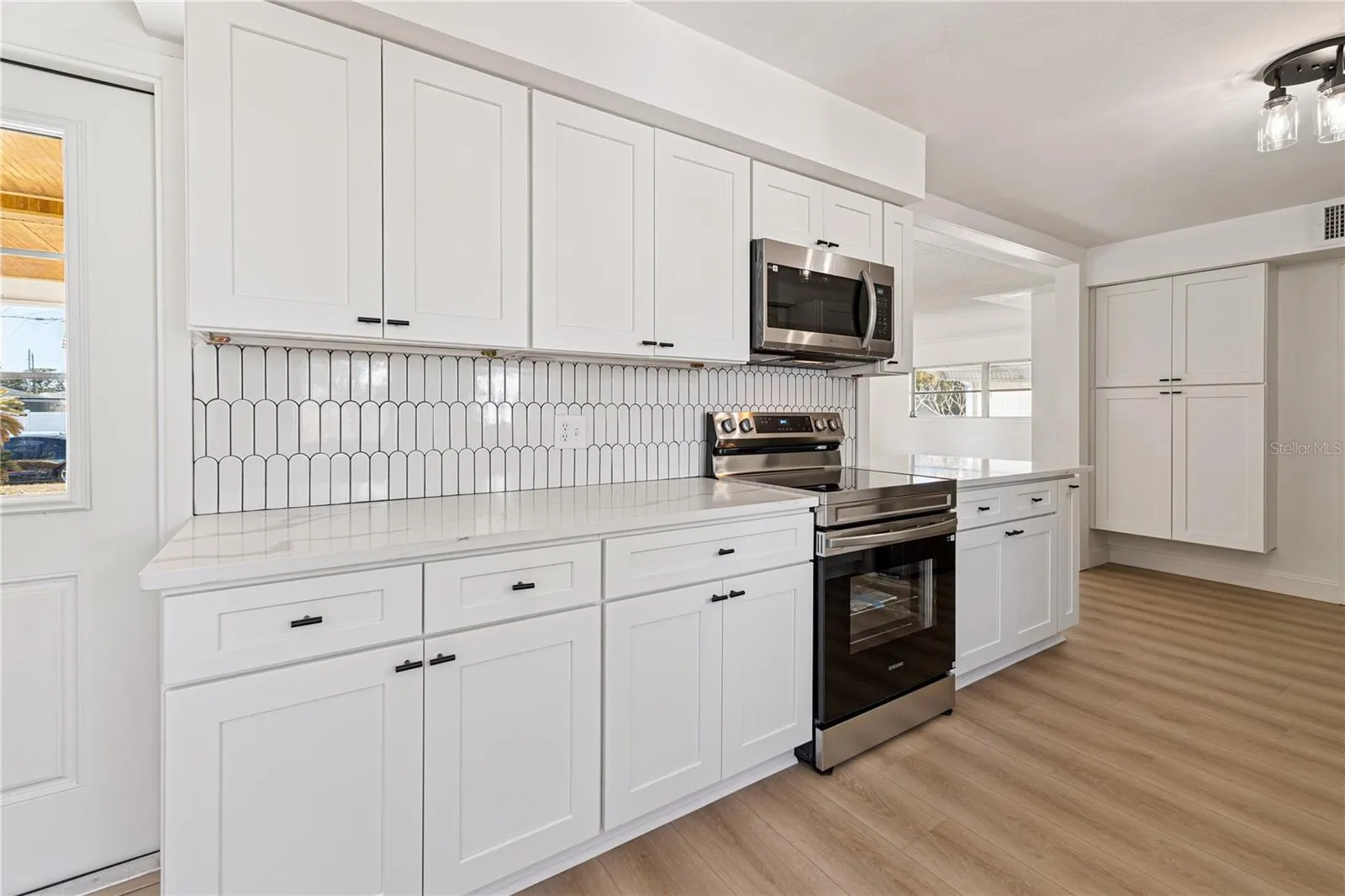 Beach-inspired luxury vinyl flooring runs throughout the home, creating a cohesive and modern feel. The kitchen is ideal for both the home chef and entertainer, featuring quartz countertops, generous counter space, and ample cabinetry for storage.