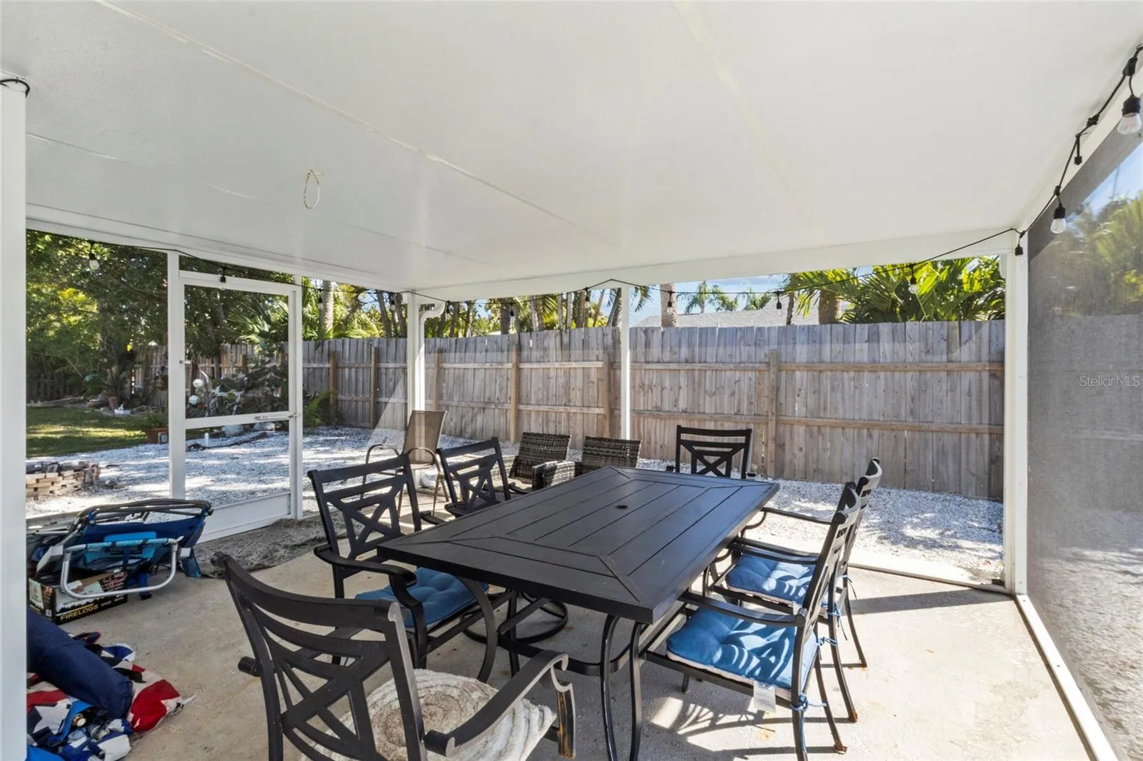 Outdoor Oasis: Off the master suite, a new impact-resistant glass door opens to a spacious, private backyard. The highlight is the expansive, screened-in enclosed porch that wraps around the back of the house, overlooking a charming outdoor fire pit and grilling area.