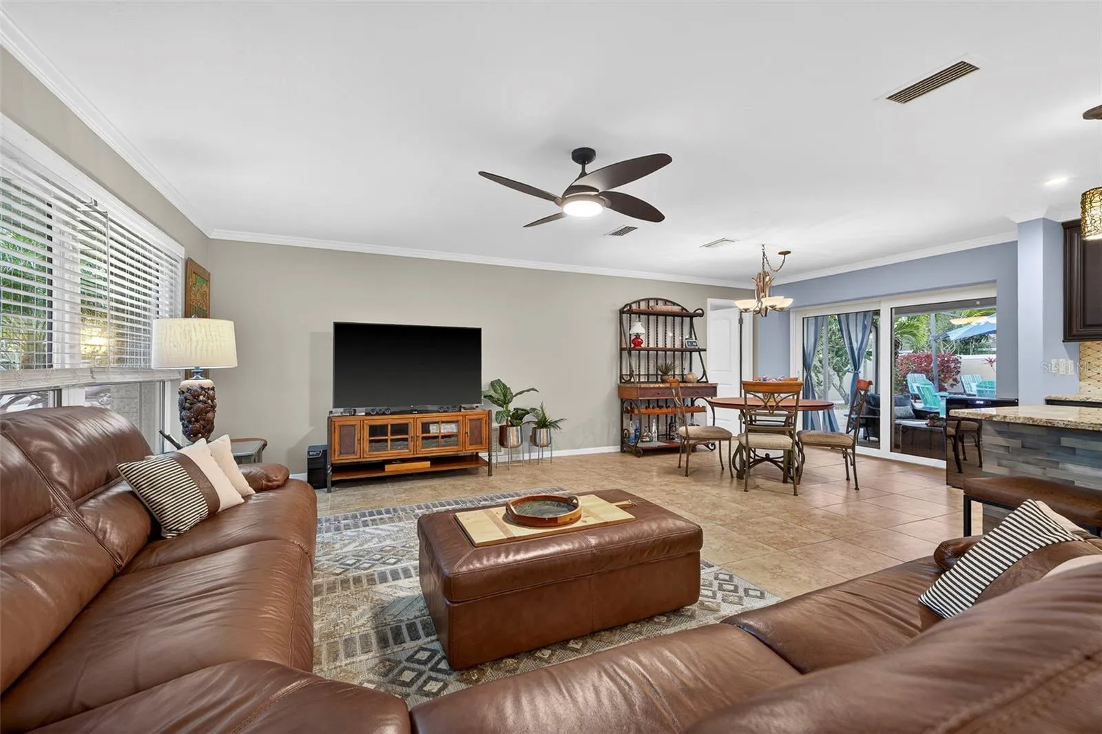 - Ceiling Fans(s), Crown Molding, Open Floorplan, Walk-In Closet(s), Eat-in Kitchen, Kitchen/Family Room Combo, Split Bedroom, Window Treatments, Solid Wood Cabinets, Solid Surface Counters, Built-in Features
