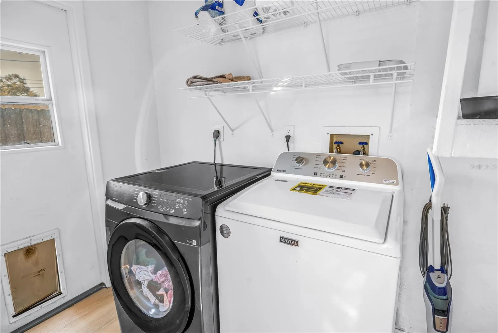 areas, Largo Central Park, Eagle Lake Park, and more! FRESHLY PAINTED inside with BRAND NEW FLOORING. Open kitchen and living room areas make the home feel more spacious. Stay out of the summer heat with an INDOOR LAUNDRY room. Large storage shed in the fenced in, private backyard with turf for easy yard maintenance. AC replaced in 2021. Located in an unincorporated neighborhood allowing for STR possibility.