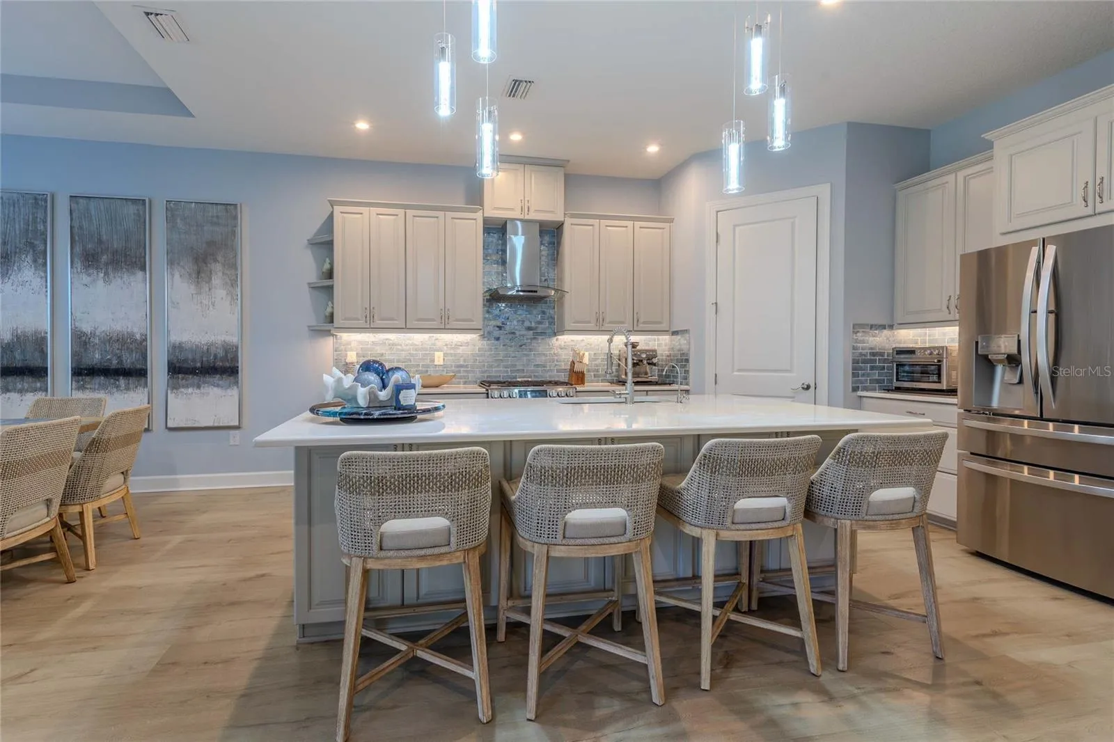 There are homes you see… and then there are homes you feel. From the moment you step inside this beautifully appointed 4-bedroom residence with a flex room/den, the sense of intention and refinement is undeniable. Located within the sought-after Esplanade at Artisan Lakes, this stunning Letizia floor plan offers 2,465 square feet of thoughtfully designed living space and lives like a model—yet feels warm, inviting, and effortlessly elegant. Built in 2021 and meticulously maintained, the home is set on a serene open conservation lot, where light pours in, and views remain unobstructed. Soaring ceilings, refined tray ceilings, and expansive 8-foot doors create an immediate sense of scale, while plantation shutters, designer lighting, and upscale ceiling fans add layers of sophistication throughout. At the center of the home, the kitchen is both striking and functional—anchored by quartz countertops, a designer backsplash, an upgraded range hood, and a premium LG gas range. Thoughtful details extend to a four-door refrigerator with craft ice, bringing a quiet sense of luxury to daily life, while durable, stylish luxury vinyl plank flooring flows seamlessly through the main living areas, setting the stage for both quiet mornings and memorable gatherings. The great room feels expansive yet intimate, complete with an in-floor electric outlet for effortless furniture placement and entertaining flexibility. Each bedroom is thoughtfully positioned, offering privacy and versatility—perfect for guests, a home office, or peaceful personal retreats. Step outside and the home opens gracefully to an extended (15’ x 23’) Phifer-screened lanai, fully fenced and pre-plumbed with water, gas, electric, and drainage for a future outdoor kitchen. With an external ceiling fan already in place, this outdoor space becomes a natural extension of the home—ideal for relaxed afternoons and unhurried evenings. Every detail has been carefully considered: an epoxied garage floor, sealed pavers on the driveway and lanai, a laundry room sink, and finishes that feel cohesive, polished, and enduring. There are no unfinished ideas here. No future projects waiting. This home is fully realized and completely move-in ready. Beyond the residence, Esplanade at Artisan Lakes offers a lifestyle as compelling as the home itself—resort-style amenities, beautifully maintained surroundings, and a community designed for ease, connection, and enjoyment. Days feel intentional. Weekends feel indulgent. This is not simply a place to live. It is a home with presence, purpose, and poise—waiting for its next chapter to begin.