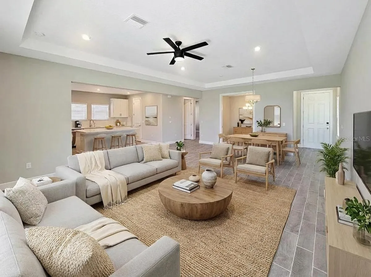 - Open Floorplan, Thermostat, Walk-In Closet(s), Living Room/Dining Room Combo, Eat-in Kitchen, Kitchen/Family Room Combo, Split Bedroom, Window Treatments, High Ceilings, Coffered Ceiling(s)