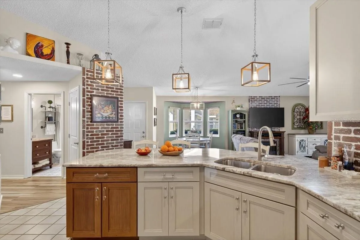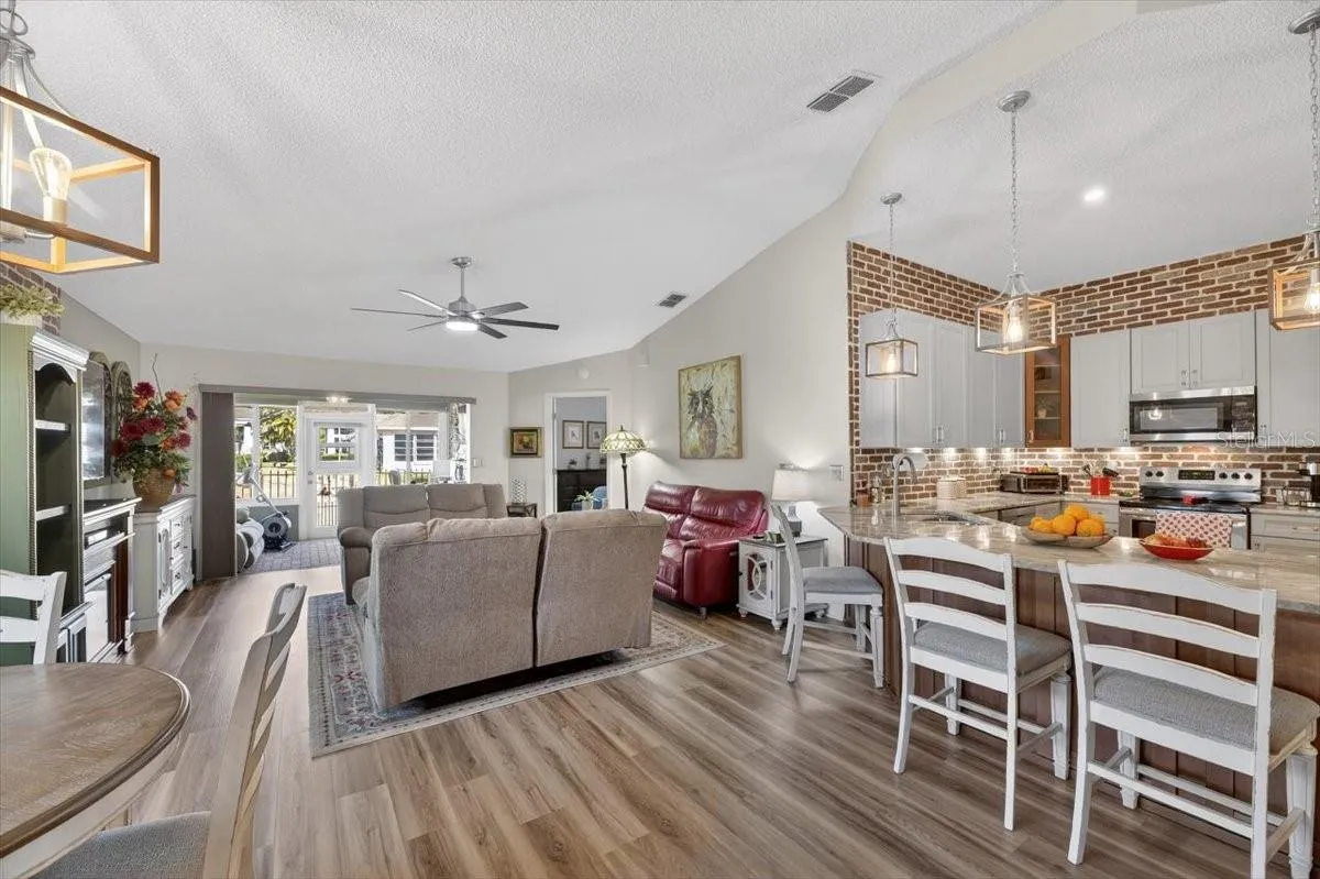 Beautifully renovated and luxuriously upgraded, this stunning 2-bedroom, 2-bath home in the highly sought-after 55+ Kings Point community seamlessly blends modern comfort with timeless elegance. This affordably priced, maintenance-free condo is spectacular throughout. Featuring real brick accent walls, stylish flooring, elegant two-panel doors, hurricane-impact windows, designer lighting and fans, custom Hunter Douglas day/night blinds, and matching SunSetter electric awnings. This residence offers true sophistication at every turn. The gourmet kitchen showcases 42″ KraftMaid cabinetry, level 4 granite countertops, a breakfast bar and wine bar, under cabinet lighting and premium appliances. The Samsung smart washer and dryer set stays with the home. Both bathrooms have been fully remodeled with floor-to-ceiling tile, new vanities, high-end fixtures, comfort-height toilets and the primary suite boasts a luxurious walk-in shower with a rain shower head and built-in bench. Additional highlights include a cozy electric fireplace, cypress wood ceiling in the bonus room, custom pantry door, California Closet systems in every closet, AND a golf cart. The 1 1/2 car garage offers pull down attic stairs and built-in overhead storage. Outdoor living is enhanced by remote-controlled SunSetter awnings, a patio with decorative iron fencing is perfect for pets and entertaining. New seamless gutters were just installed. A new roof was installed in January 2026. There’s nothing to do here but move-in and start enjoying the Kings Point lifestyle. Residents of Kings Point enjoy world-class amenities including two spectacular clubhouses, six heated pools, hot tubs, fitness centers, golf courses, tennis, pickleball, billiards, an 850-seat theater, the Serenity Spa and countless clubs and social events—all within a secure, gated community offering 24/7 security, free paramedic and ambulatory services, and condo fees that cover high-speed internet, premium cable, water, sewer, landscaping, exterior maintenance, pest control, trash, roof, building insurance, and lower taxes. With a free transportation system, golf-cart access to shopping and dining, and close proximity to Florida’s top attractions including beaches, Disney, Busch Gardens, and Tampa’s cruise port, this exquisite home offers the ultimate in luxury, lifestyle, and peace of mind—an exceptional opportunity to experience resort-style living at its finest.